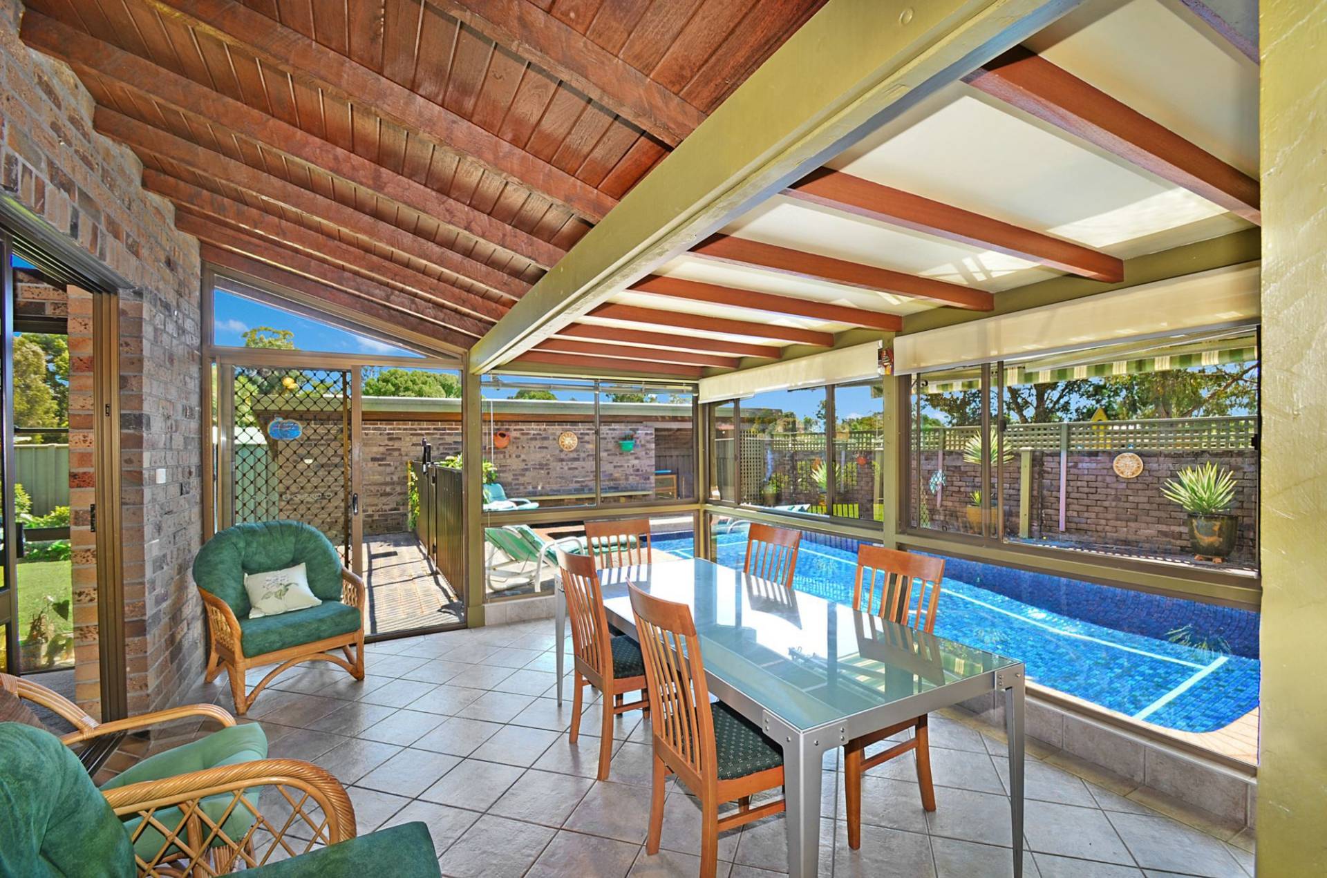An extensive glass-enclosed sunroom offers further living flexibility with a beautiful outlook over the sparkling inground tiled swimming pool.
