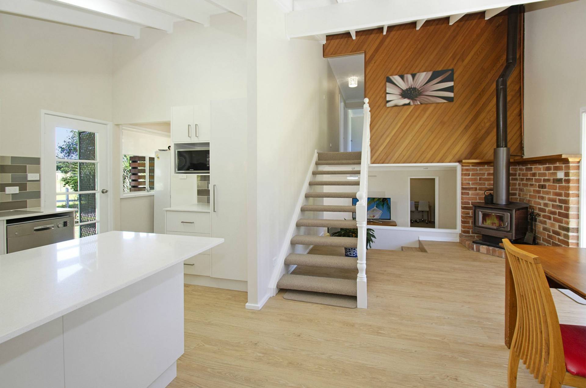 Offering an open plan split-level layout the living and dining zones extend out through sliding doors to outside entertaining areas.