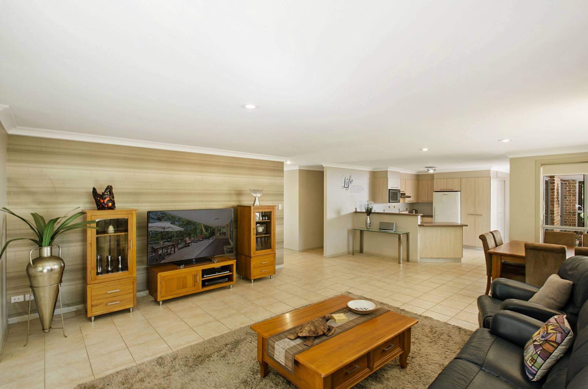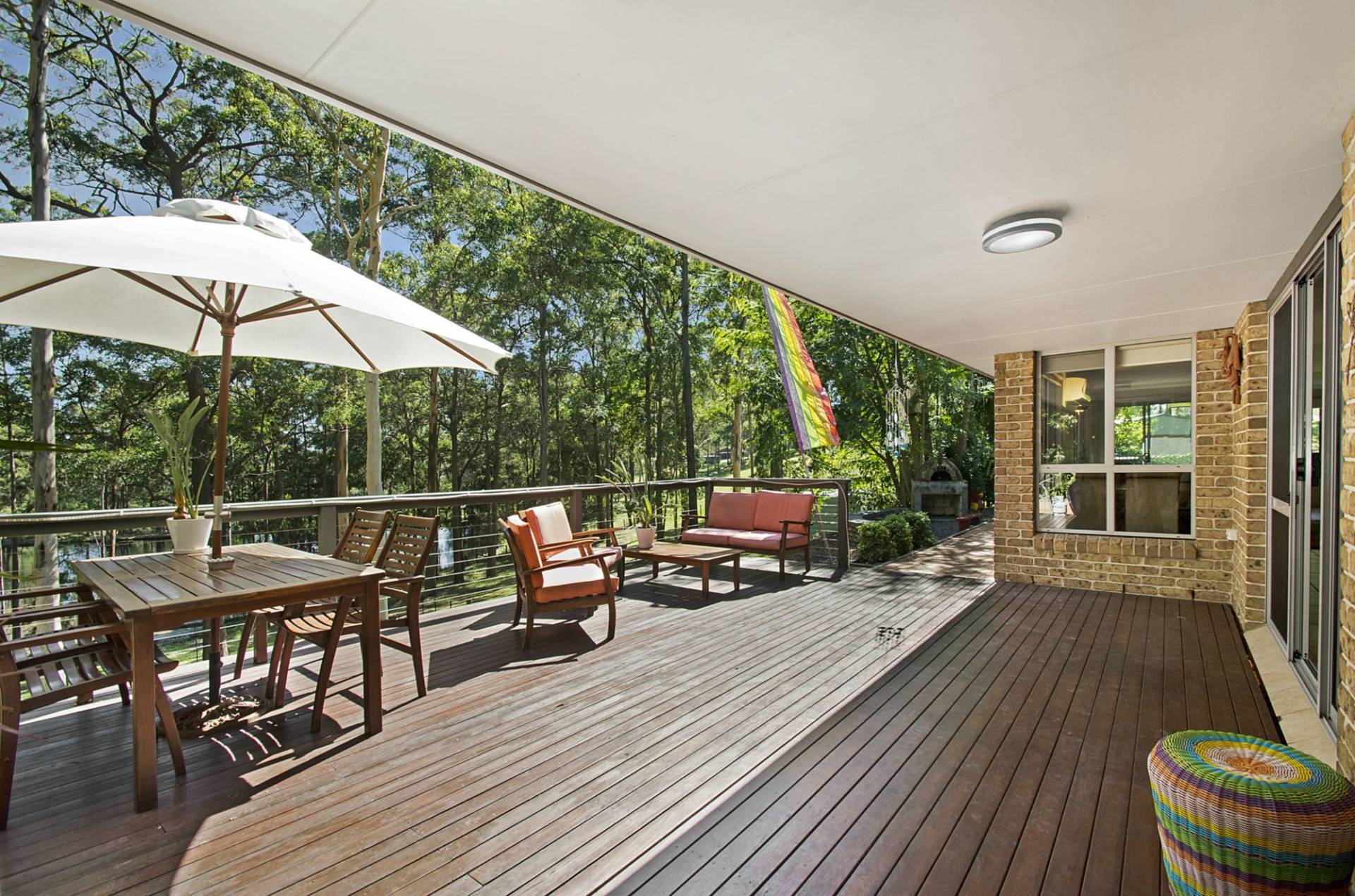 The sleek open plan living, dining, kitchen zone connects via sliding doors to the large rear deck offering indoor/outdoor living with the bonus of a wood-fired pizza oven, perfect for al fresco dining while enjoying the dam and bush outlook.