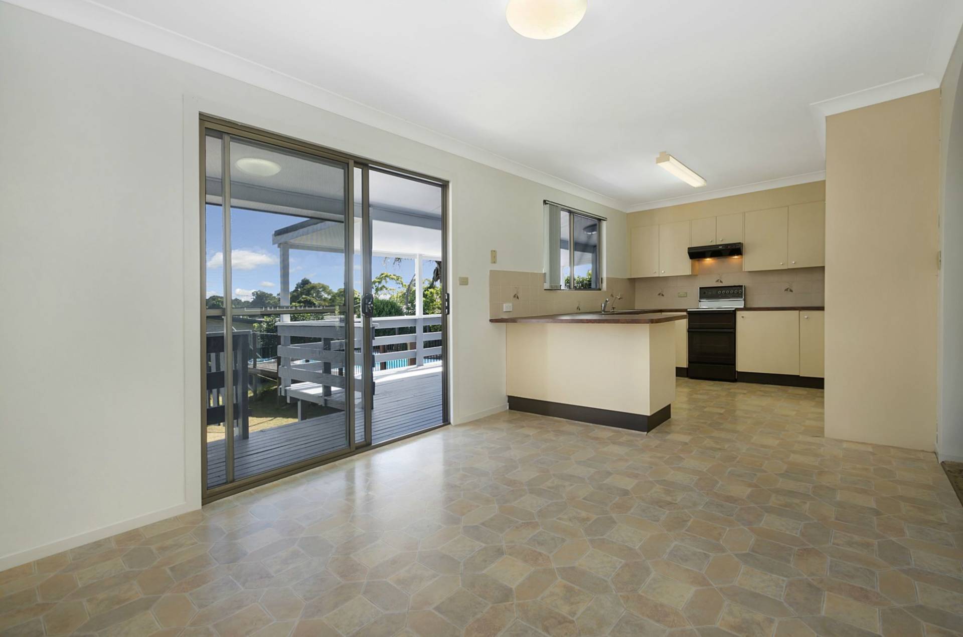 There is a large living area and the kitchen dining area connects to the rear verandah via sliding doors.