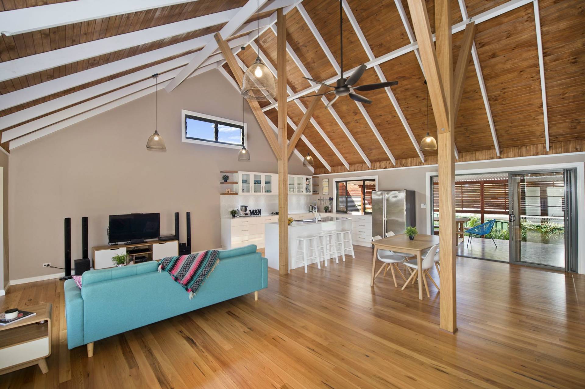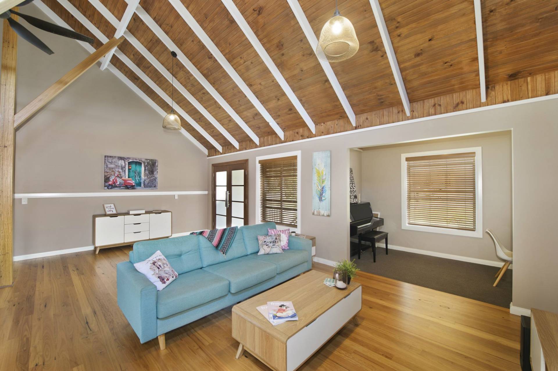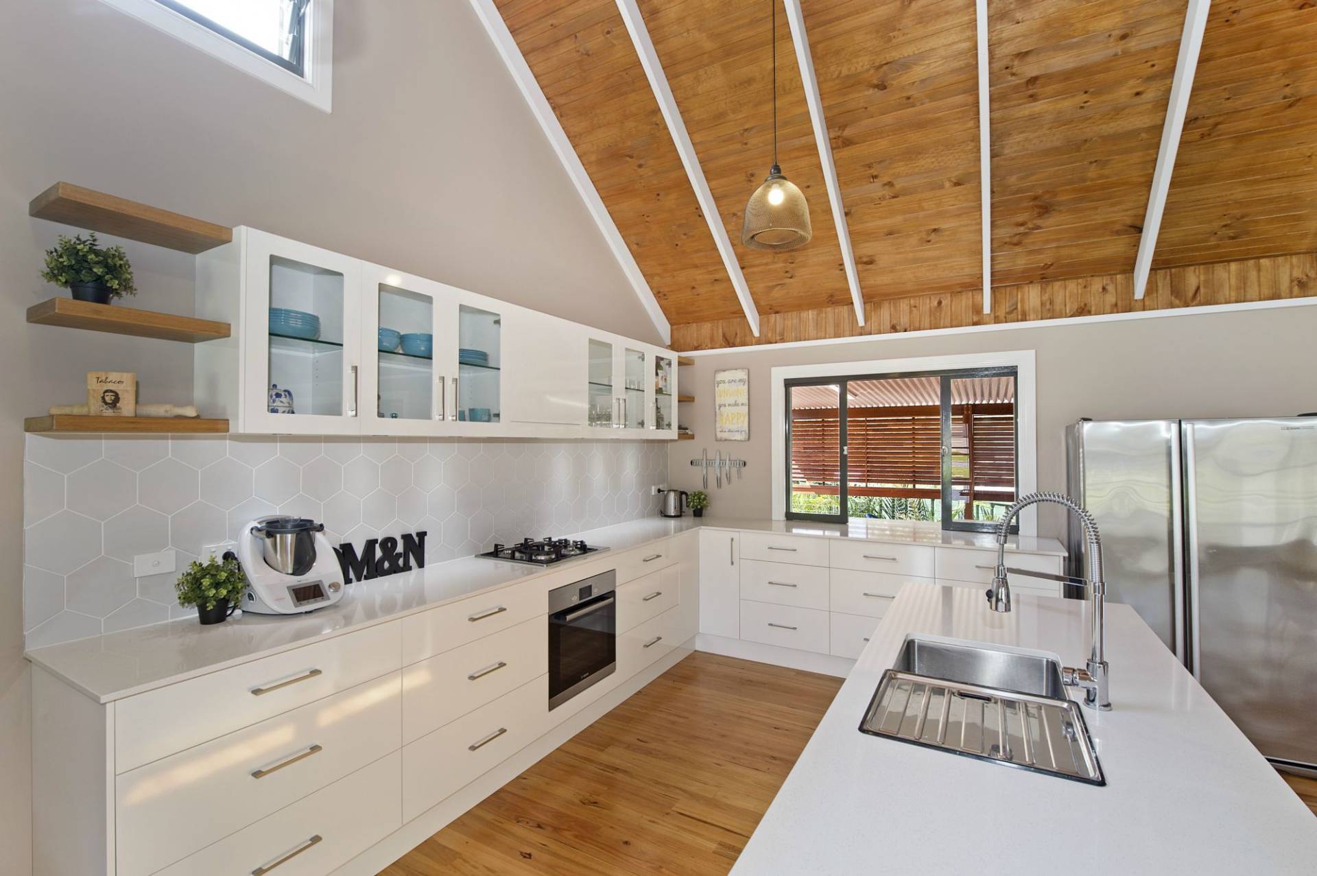 On the main level is the living, dining and kitchen zone with separate study nook that features soaring cathedral ceilings, blackbutt flooring and sliding doors that lead to a large rear verandah. The kitchen is perfect for entertaining and enjoys Caesar stone benchtops, sensor downlights, Bosch appliances and naturally acts as the hub of the home.