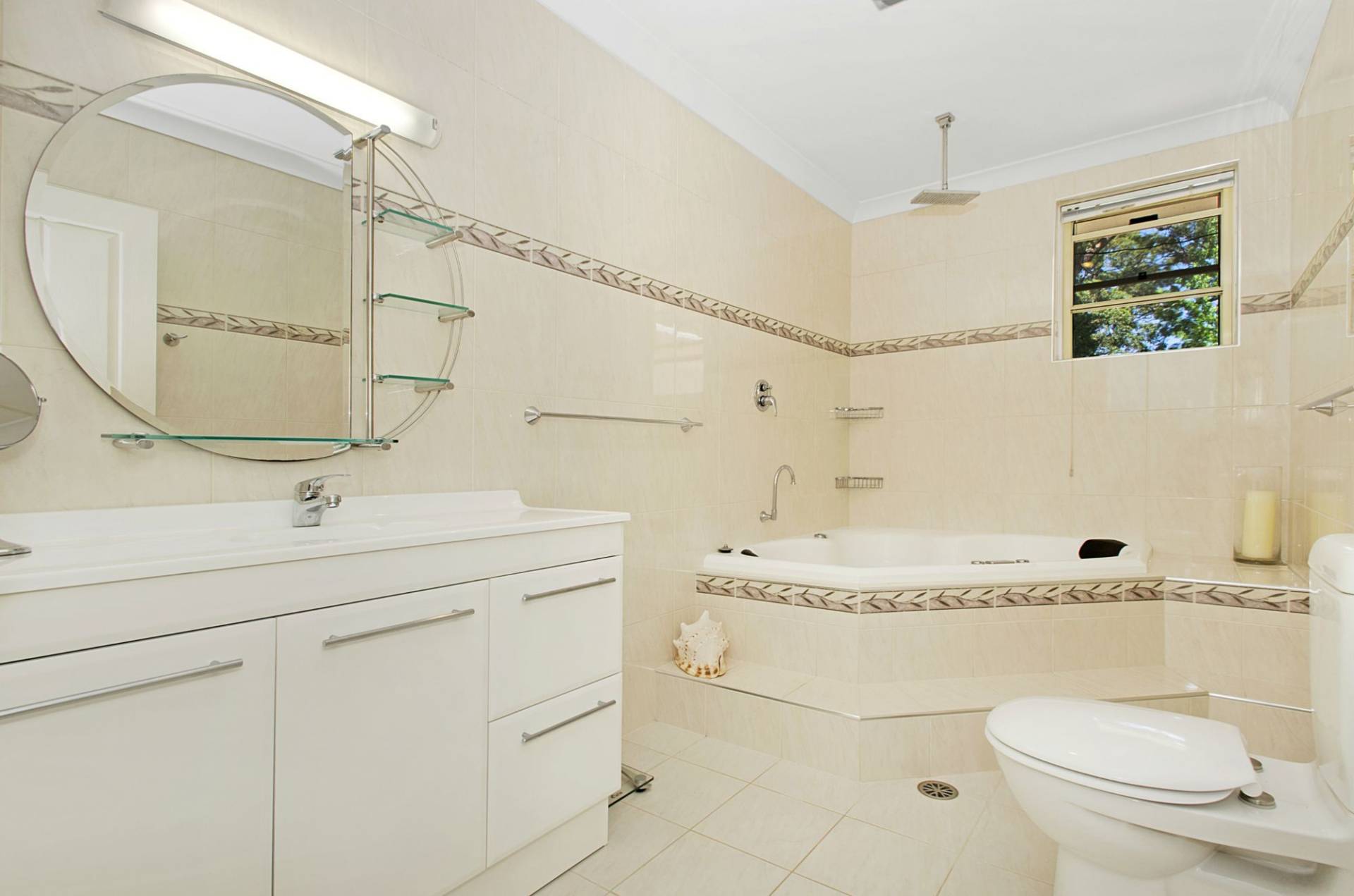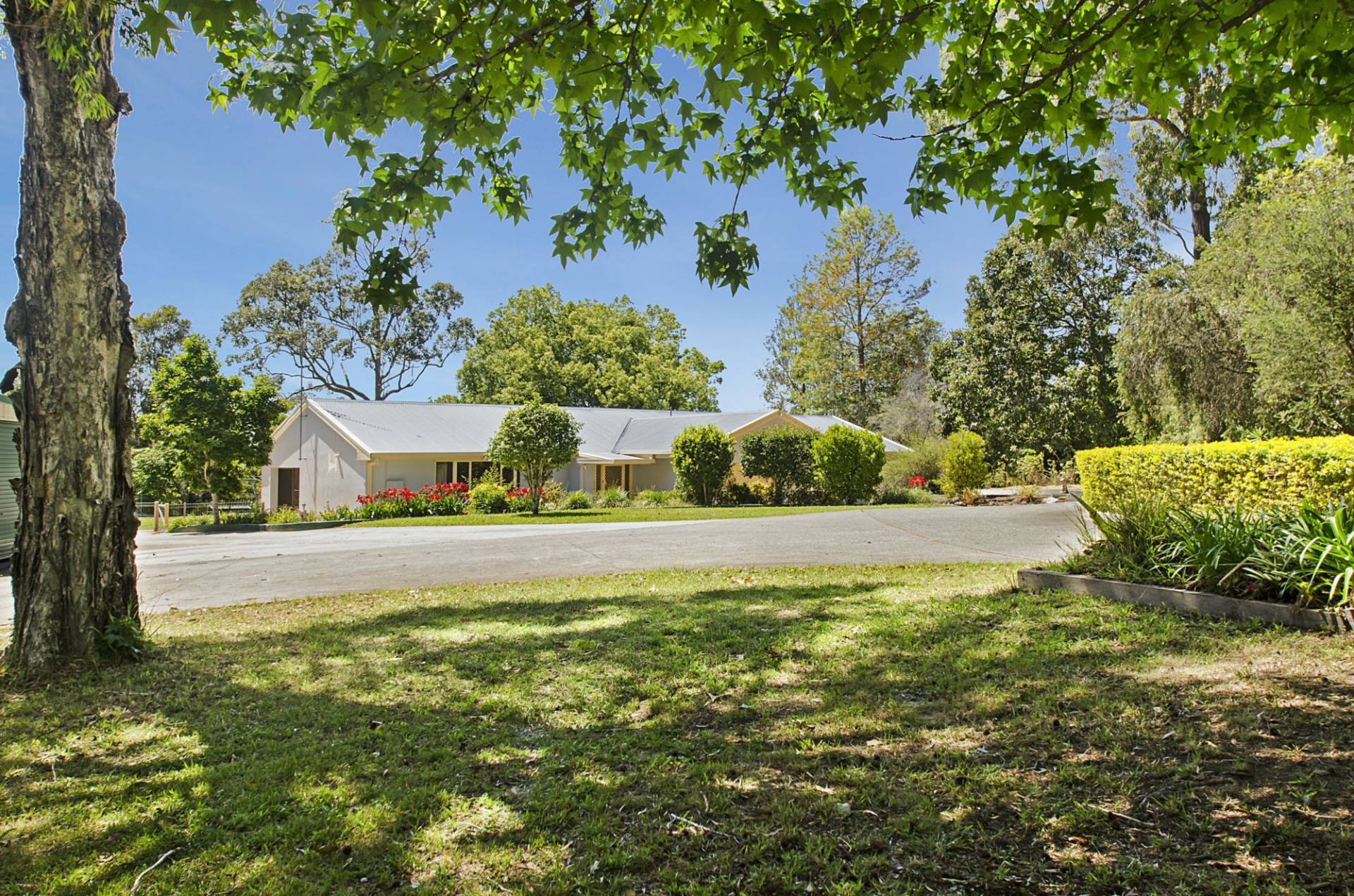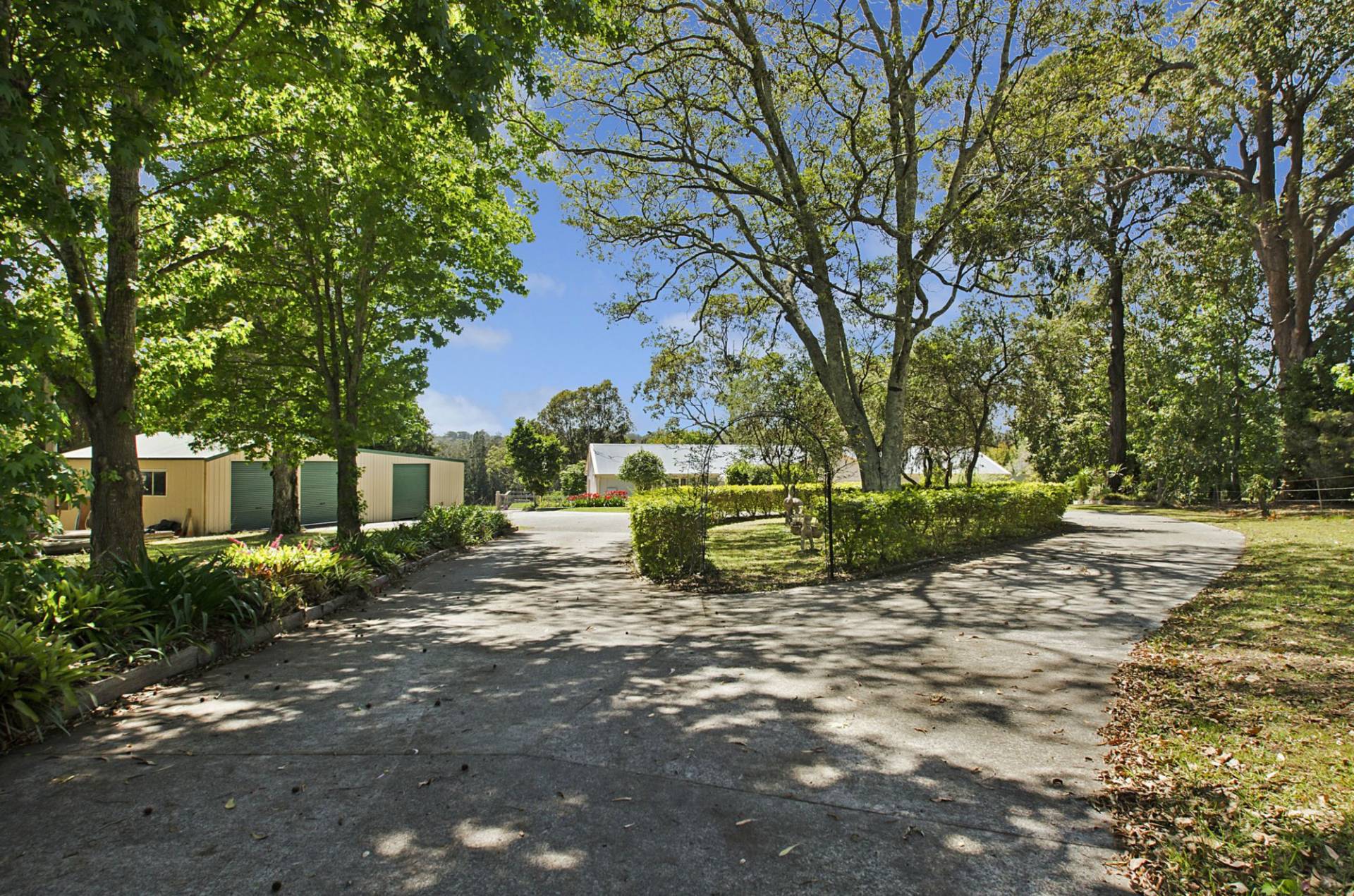 The easy care mature gardens are hidden behind a well established front hedge which provides privacy to the substantial home set back on the property which you enter via the circular driveway.
