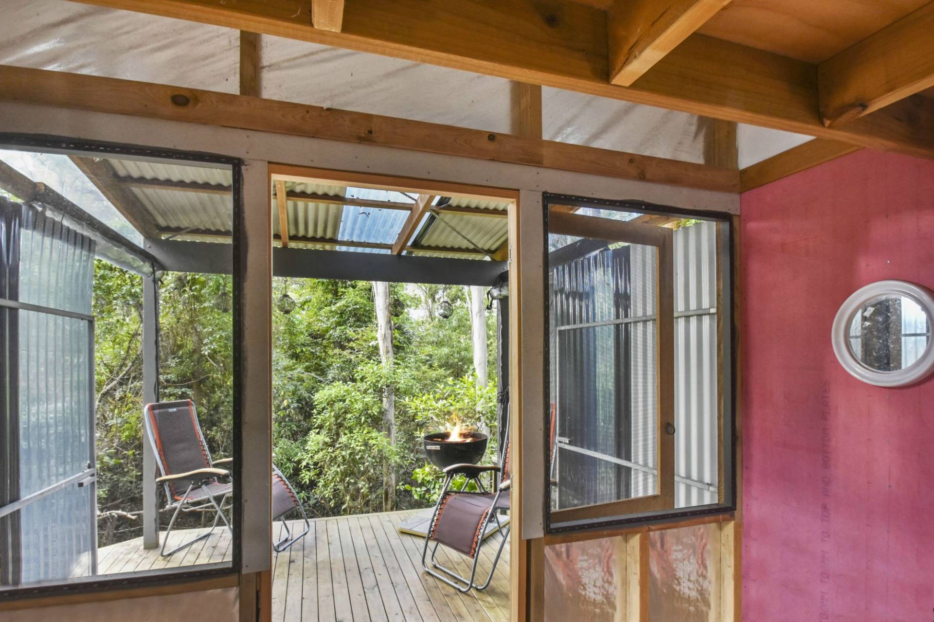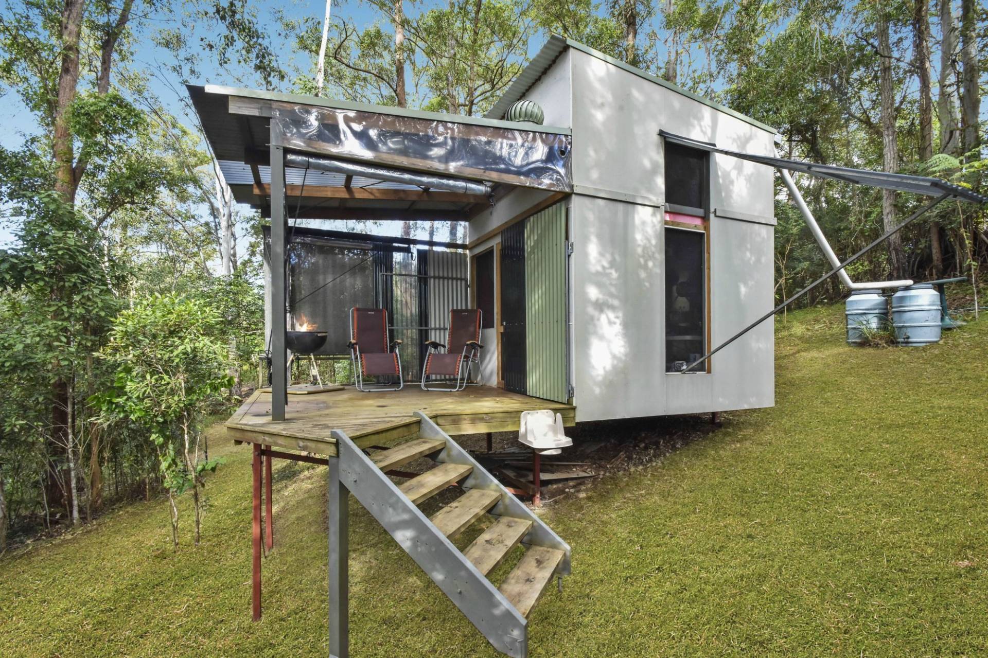 The cute cabin is set up with a loft sleeping area and living space that opens out onto a peaceful timber deck.