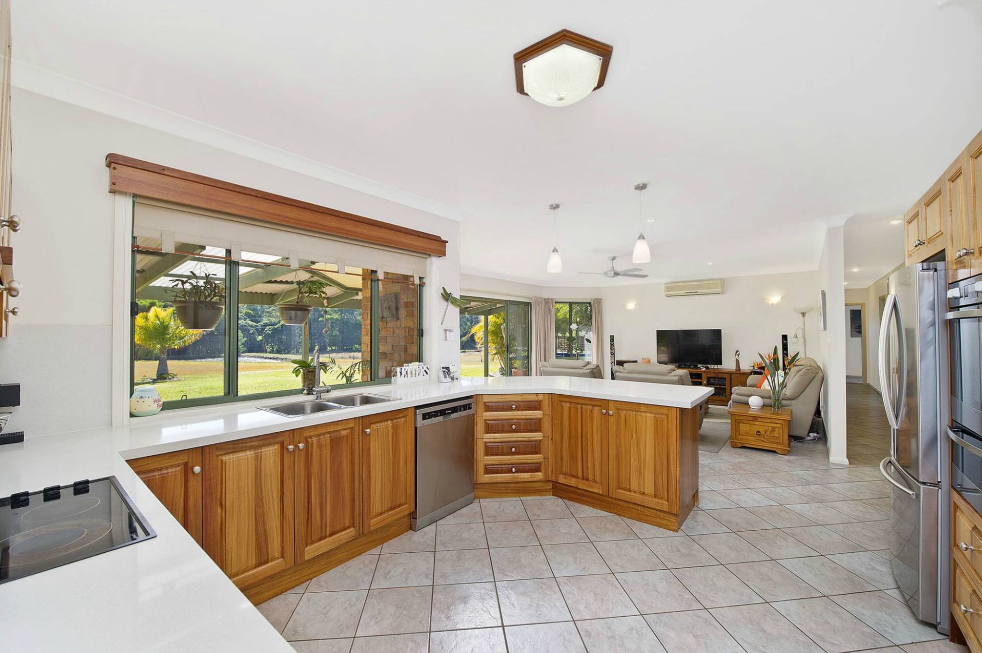 The family room combines with the sleek kitchen that enjoys Blackwood cabinetry, caeser stone benchtops, new appliances and a walk-in pantry.
