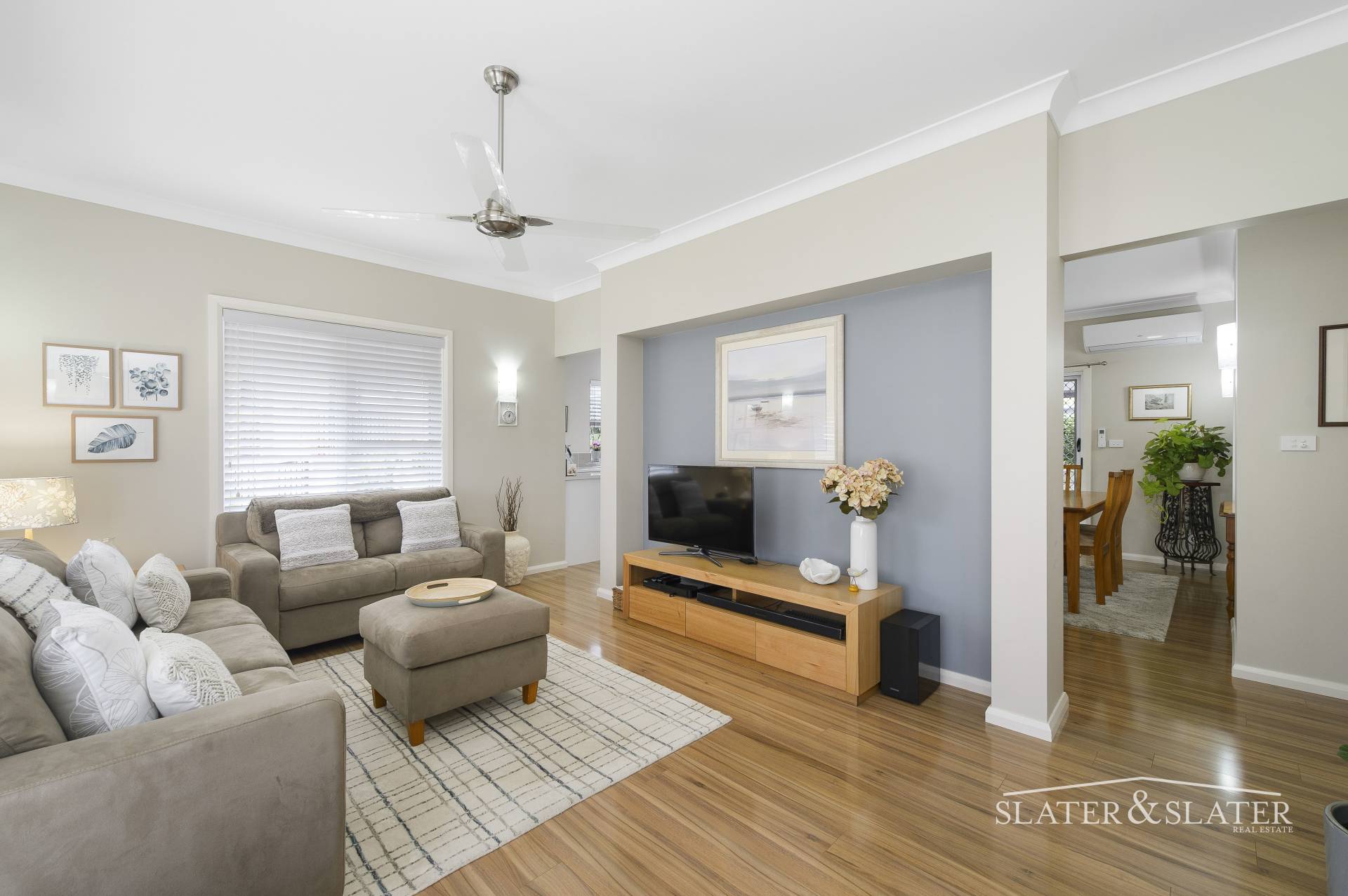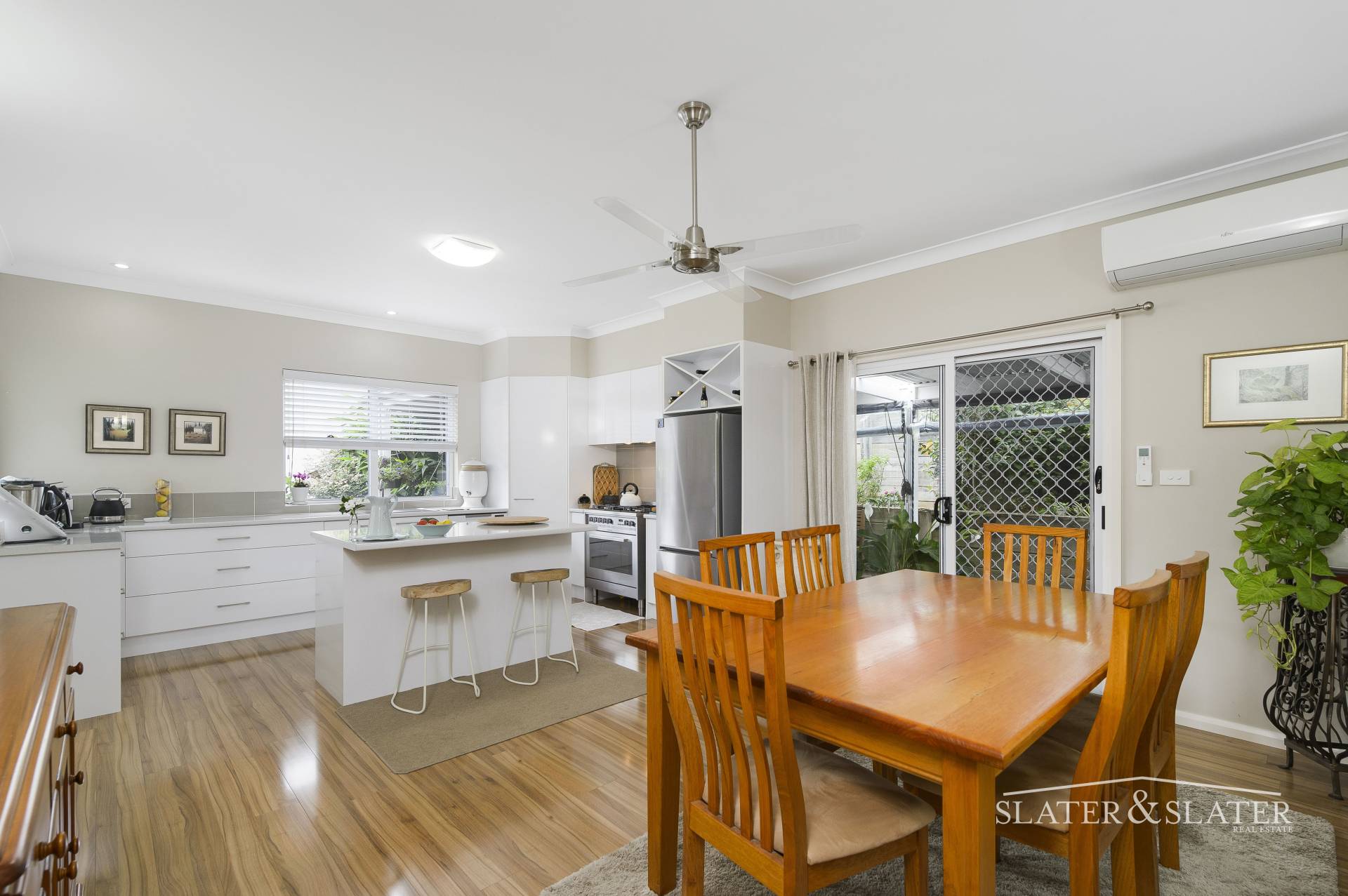 The double door entry reveals a generous air conditioned living room at the front of the home that flows through to the kitchen/dining zone.