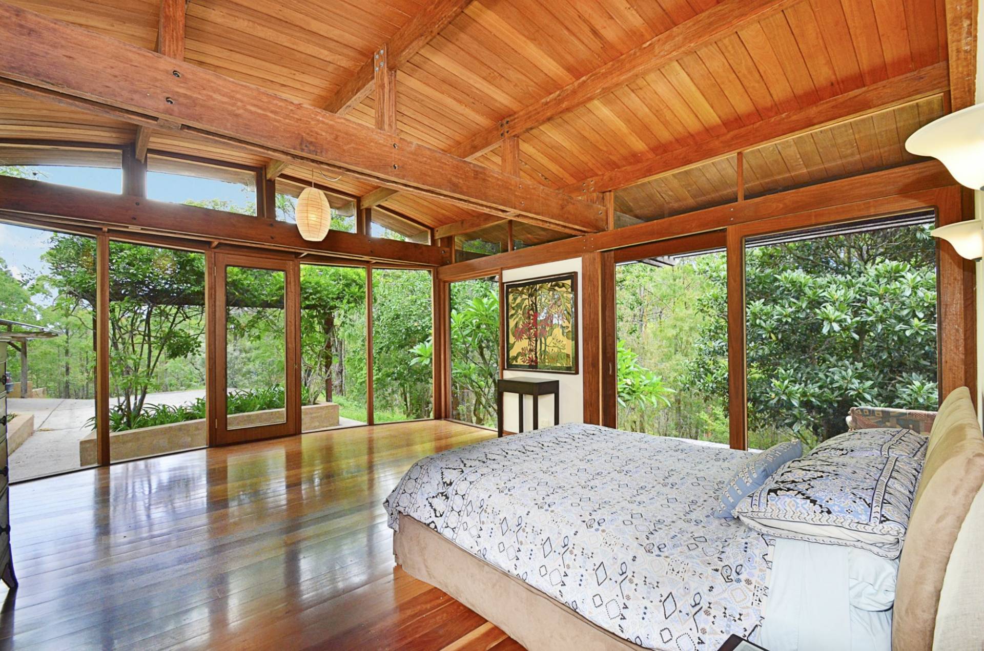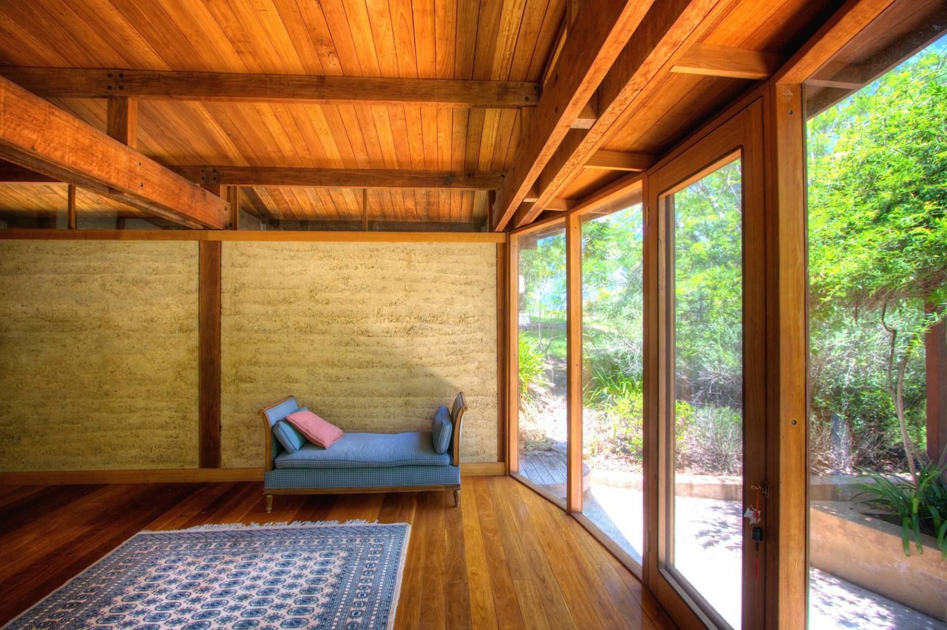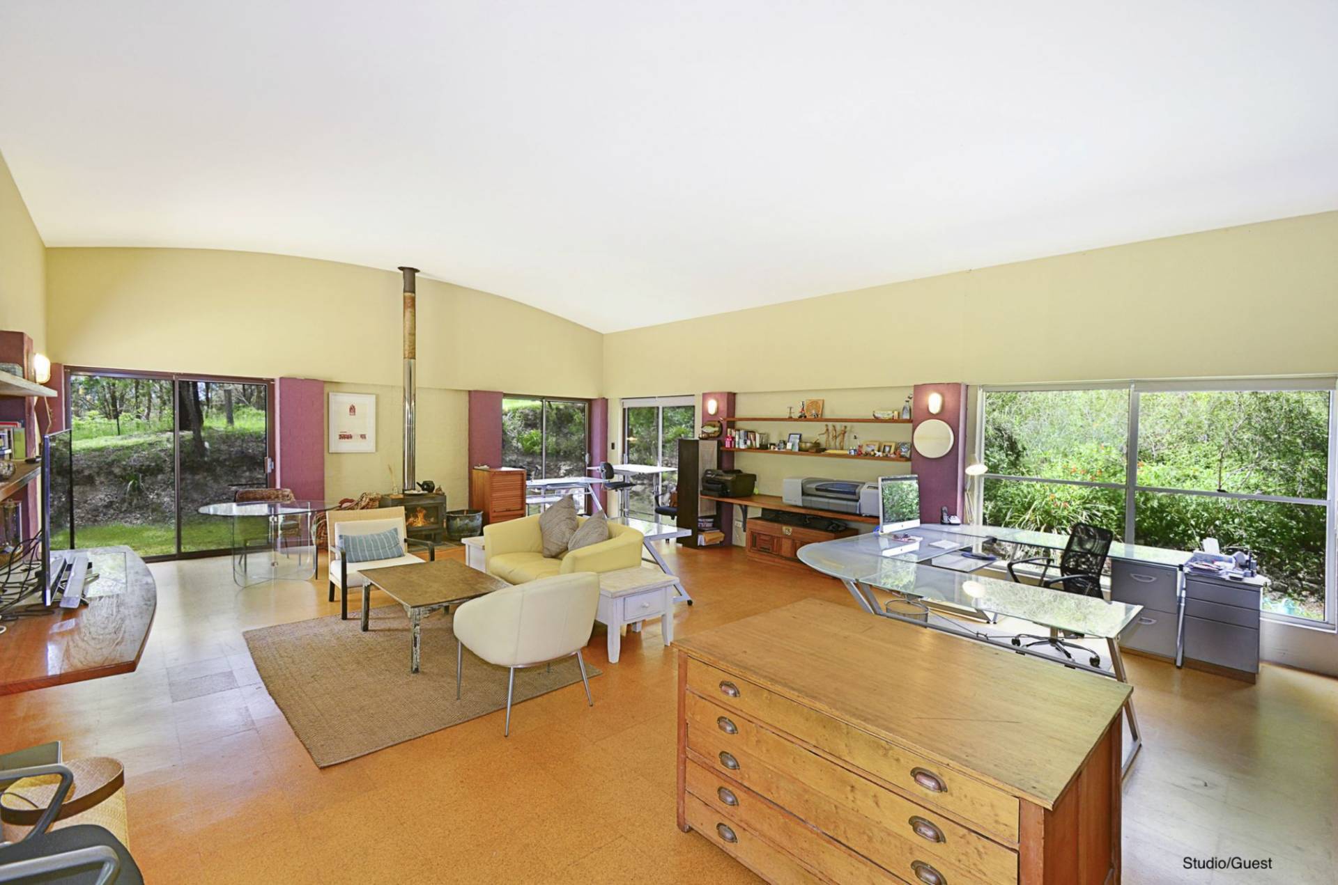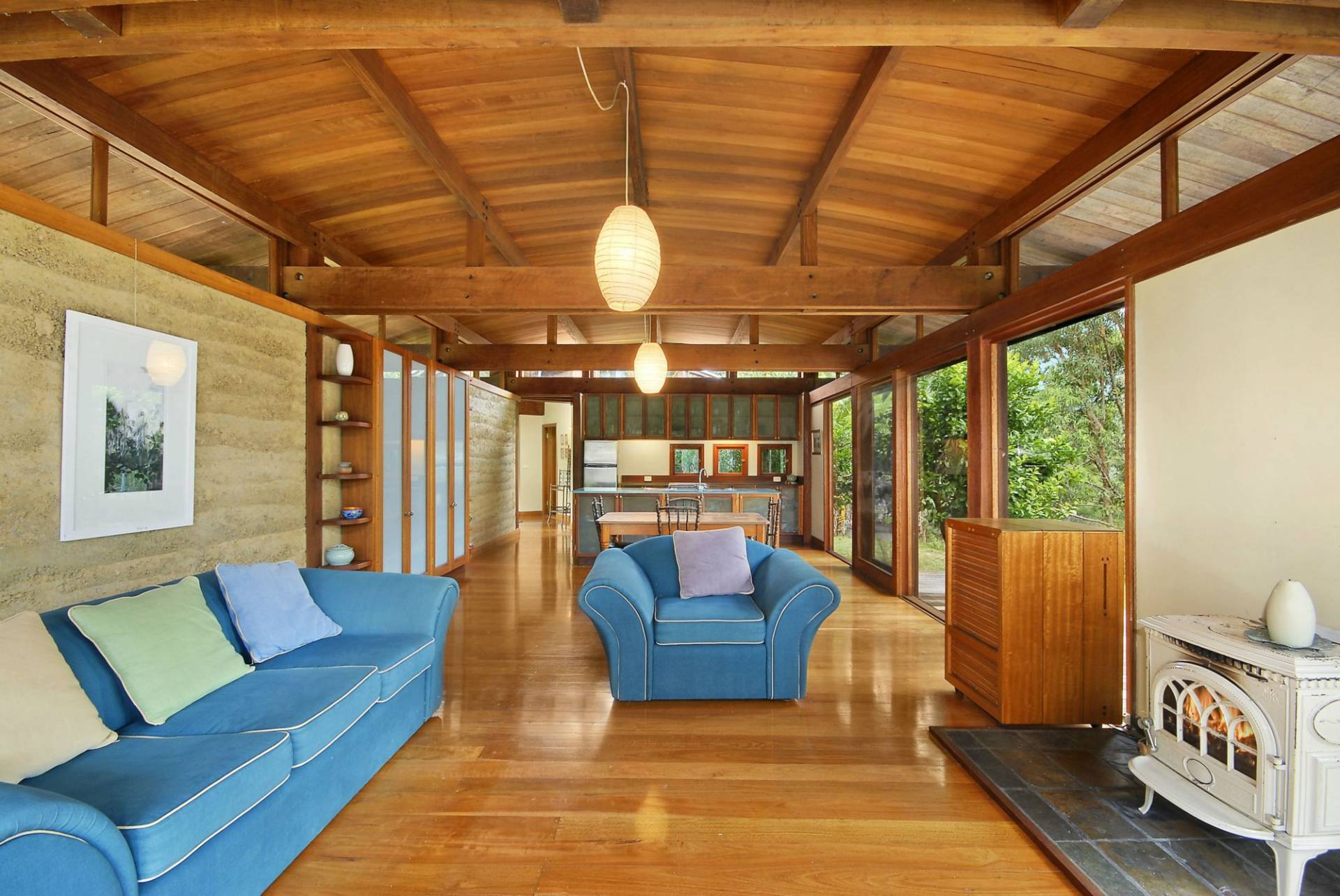 Set on a forested 26.5ha (65 acres) the property comprises three connected buildings featuring impressive timber construction with rammed earth.