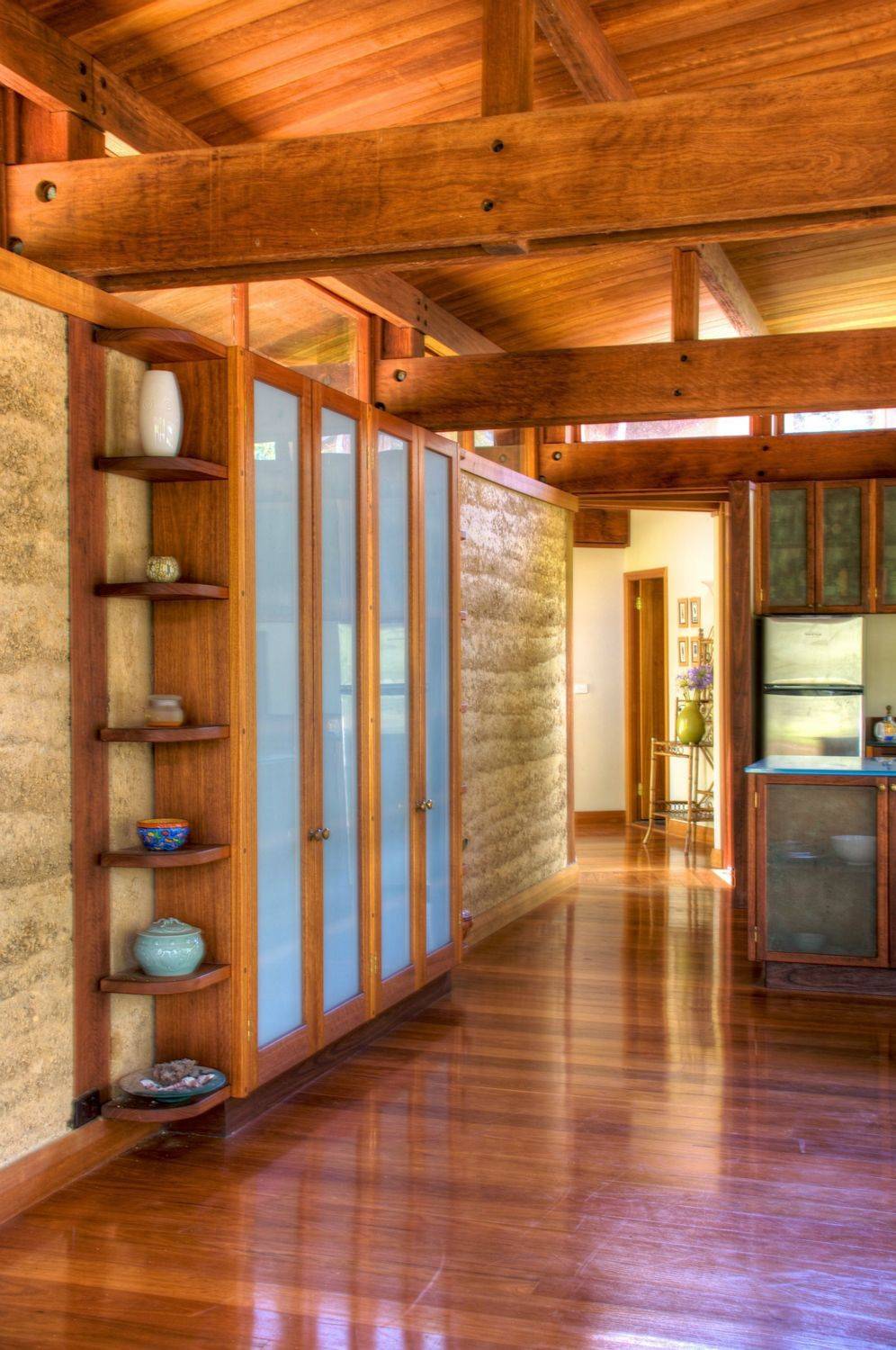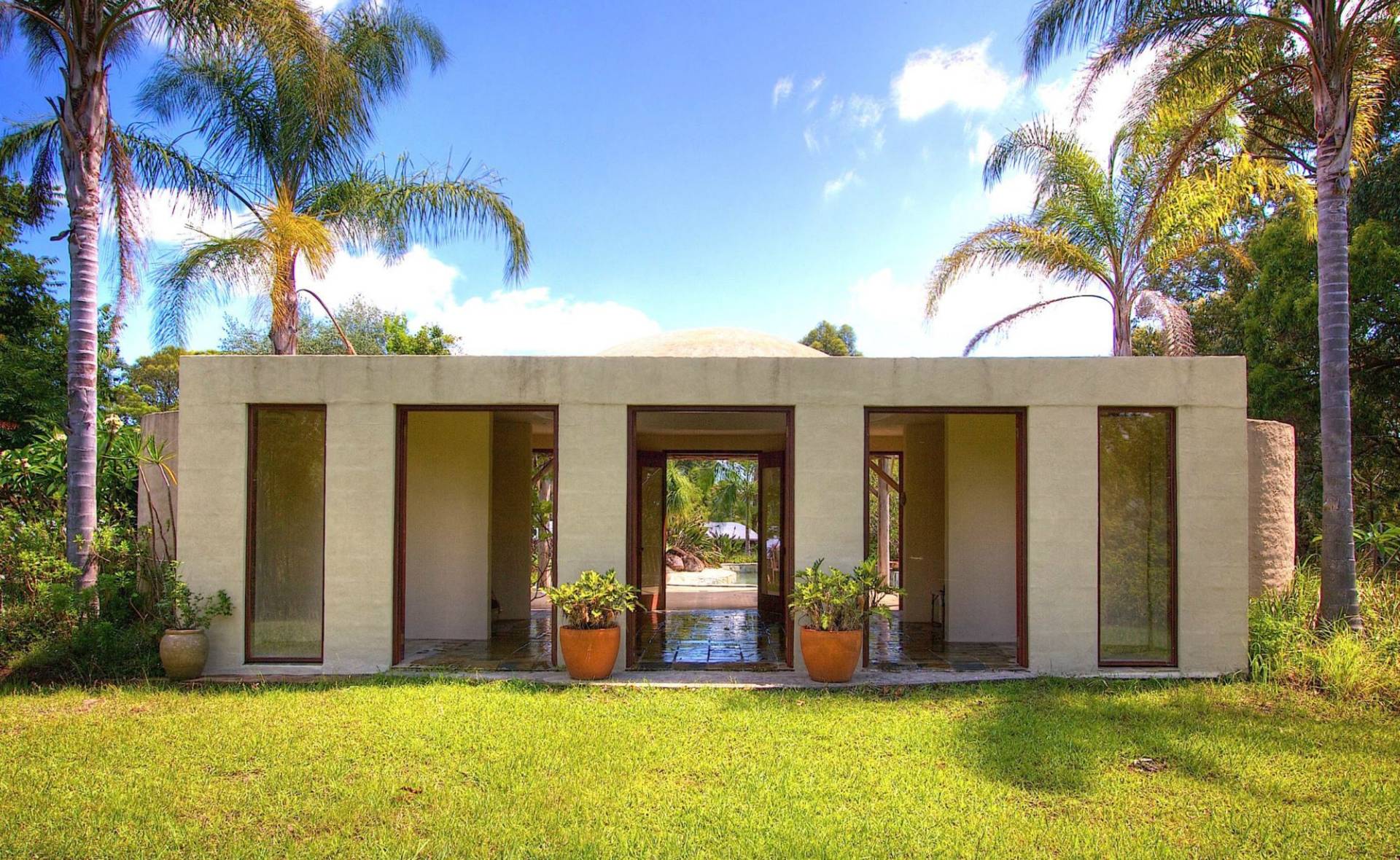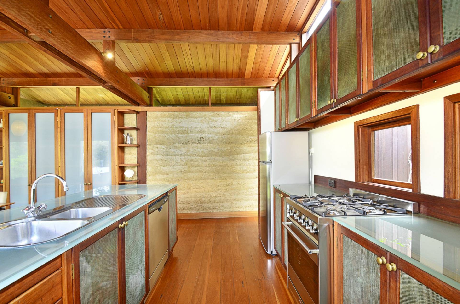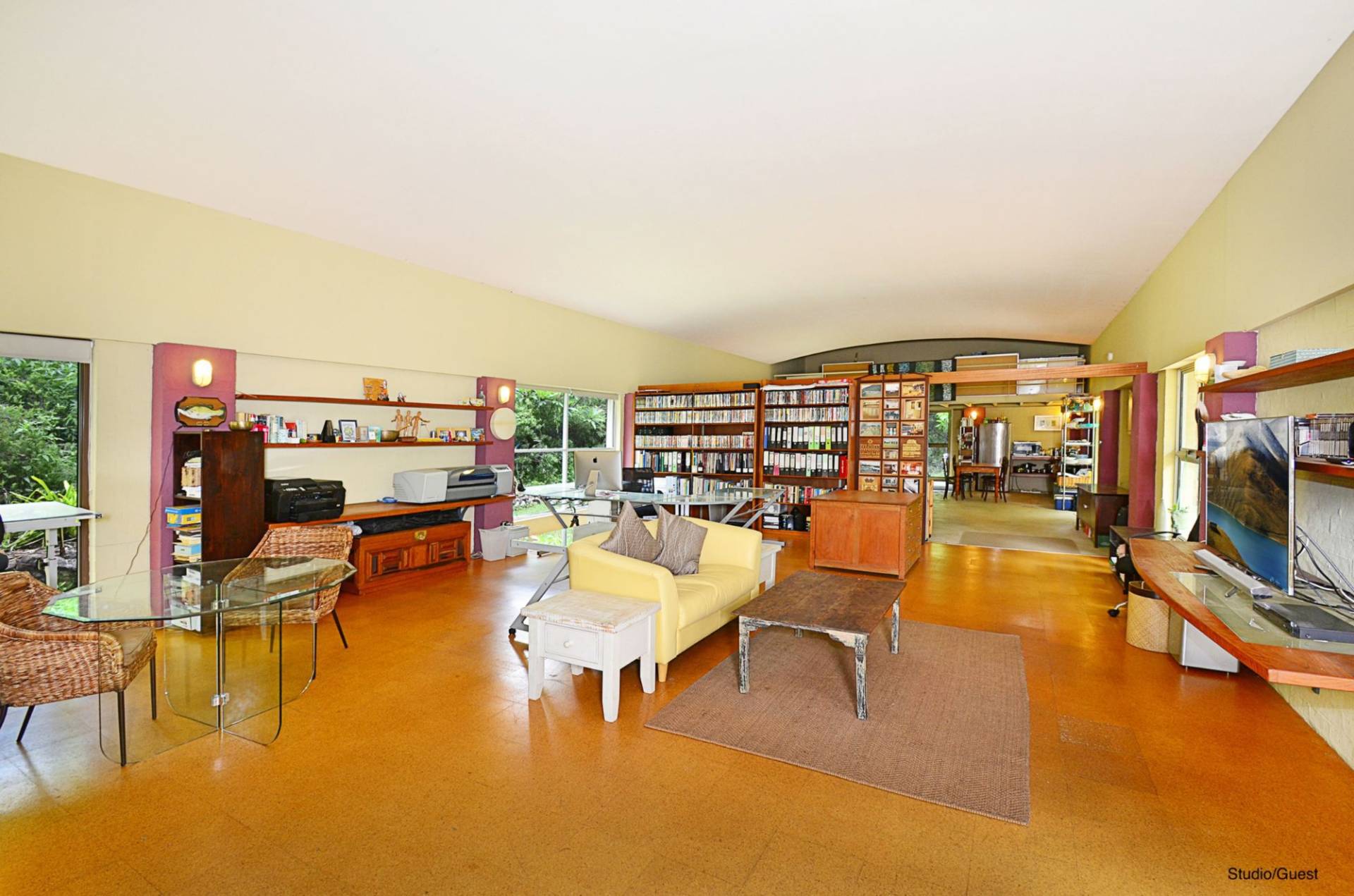 Set on a forested 26.5ha (65 acres) the property comprises three connected buildings featuring impressive timber construction with rammed earth.