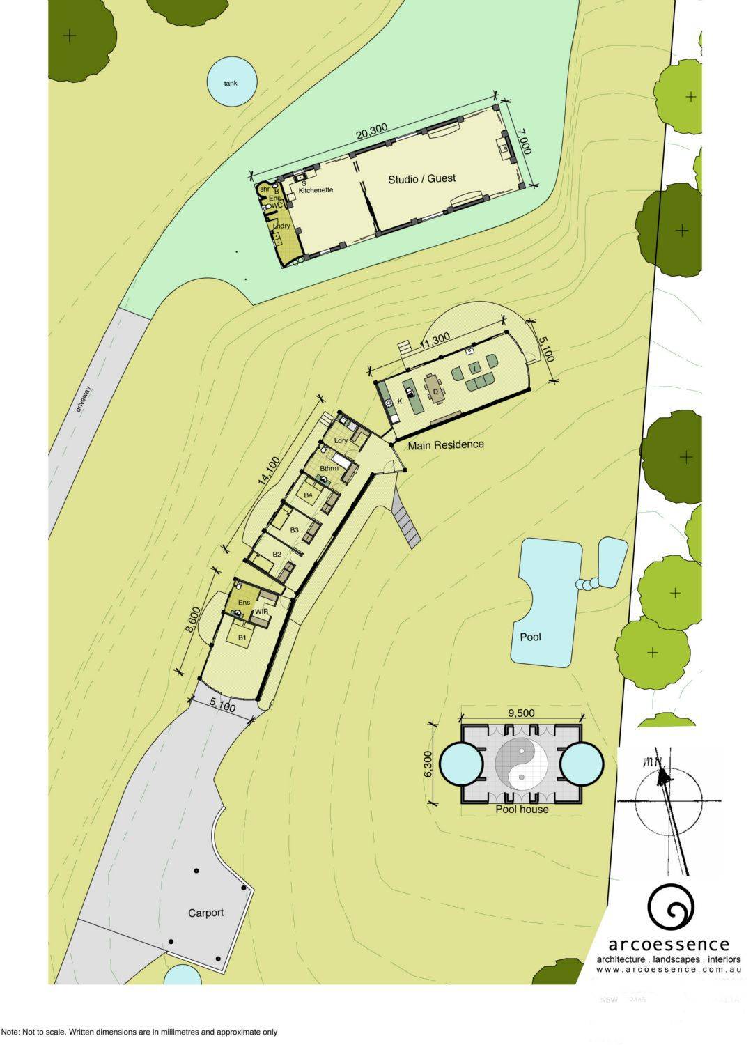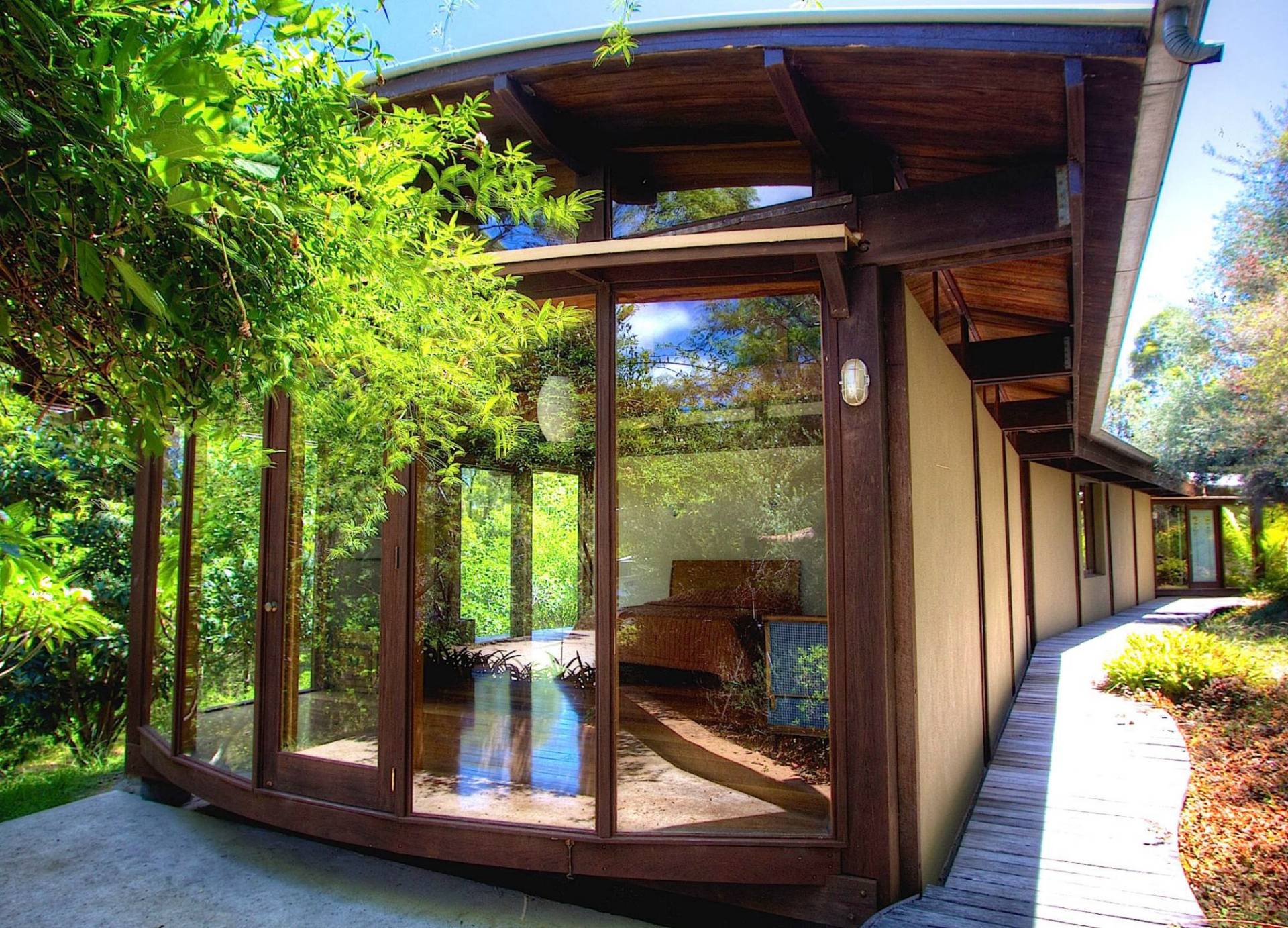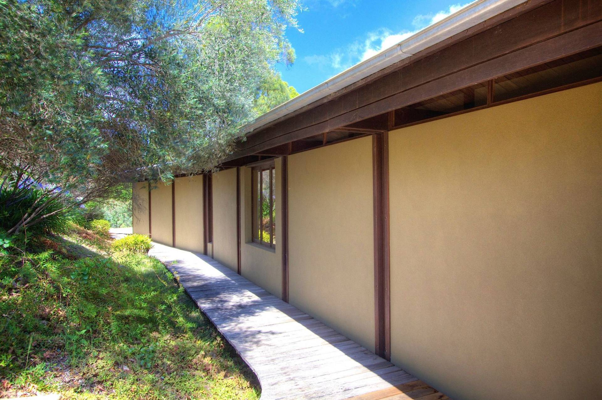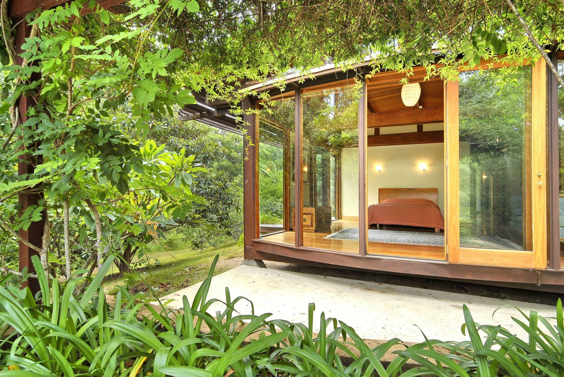 Set on a forested 26.5ha (65 acres) the property comprises three connected buildings featuring impressive timber construction with rammed earth.