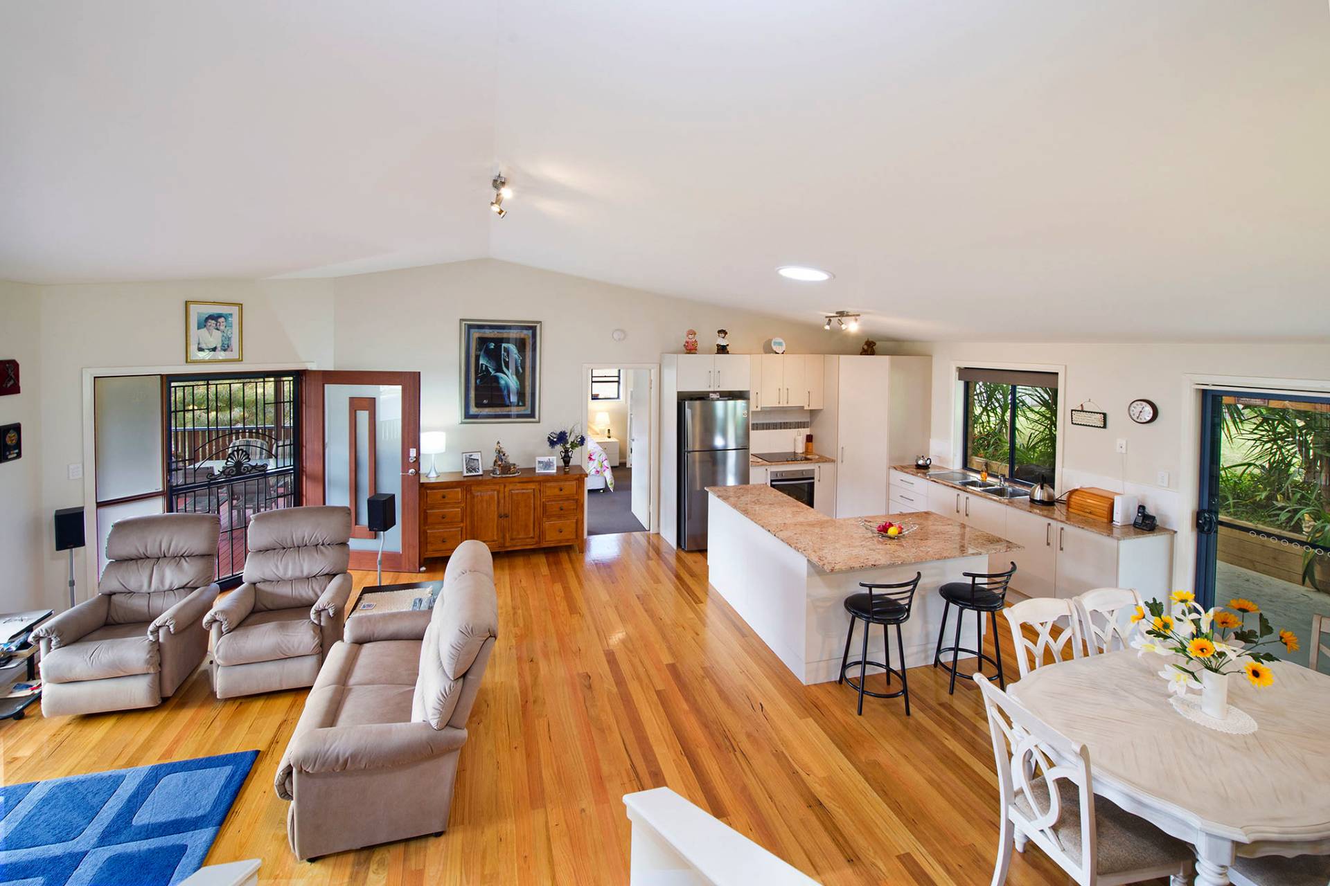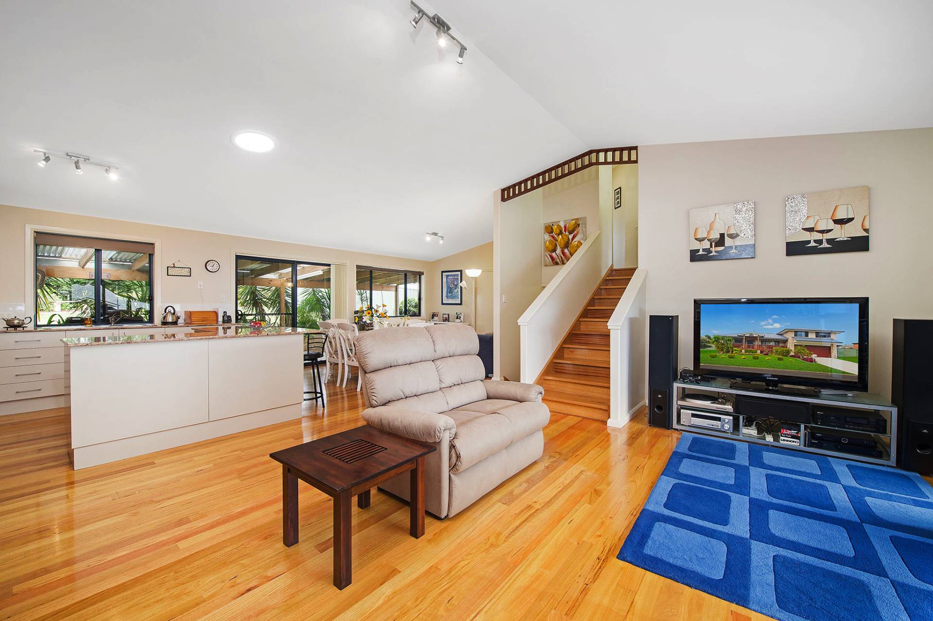 Spread across three levels, steps lead up from the double garage into the substantial open plan kitchen, living and dining area that enjoys vaulted ceilings, wooden floorboards and plenty of natural light.