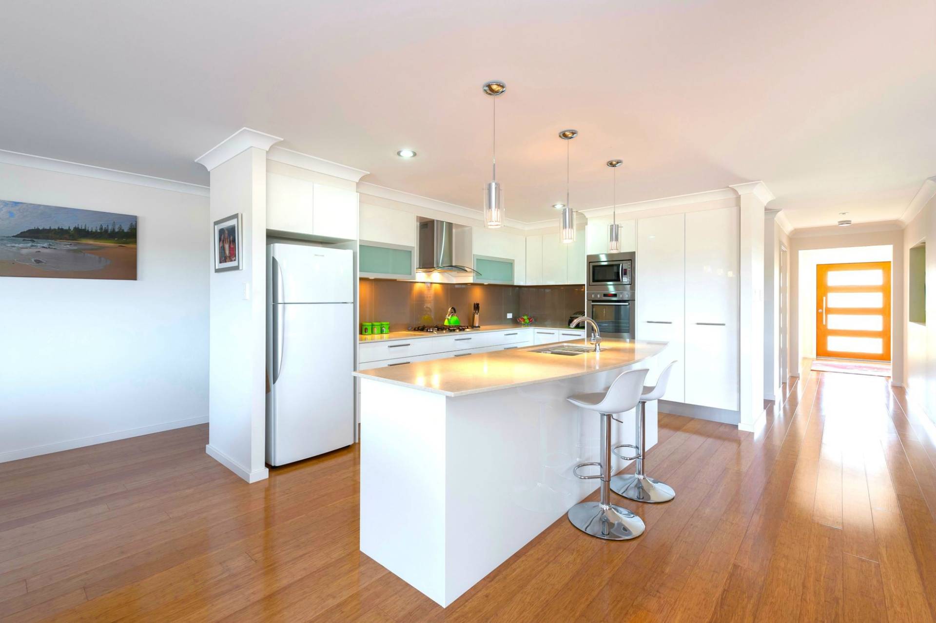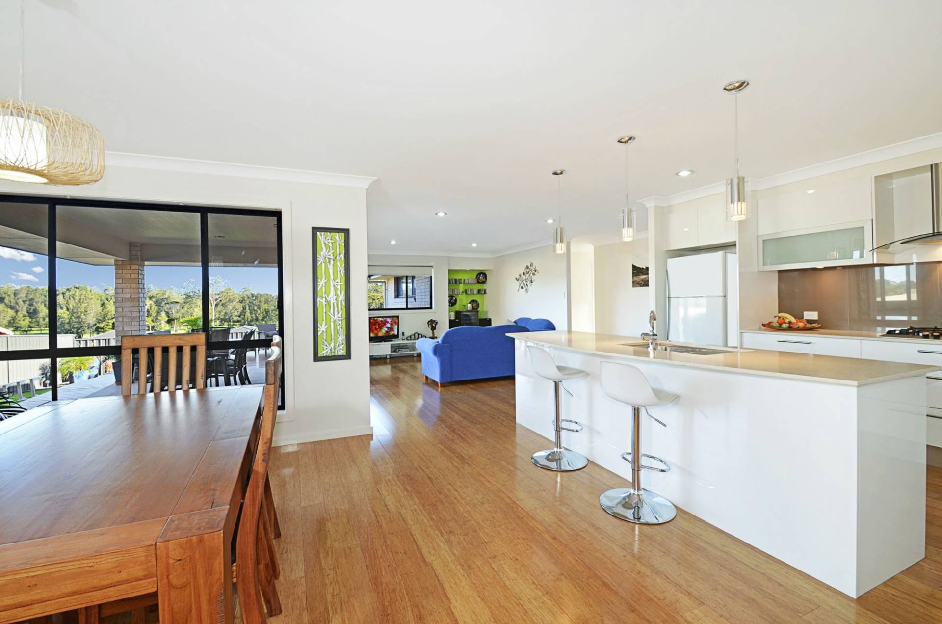 The generously proportioned open plan living space offers bamboo flooring and a sleek kitchen complete with Caesar stone bench tops and soft touch opening cupboards.