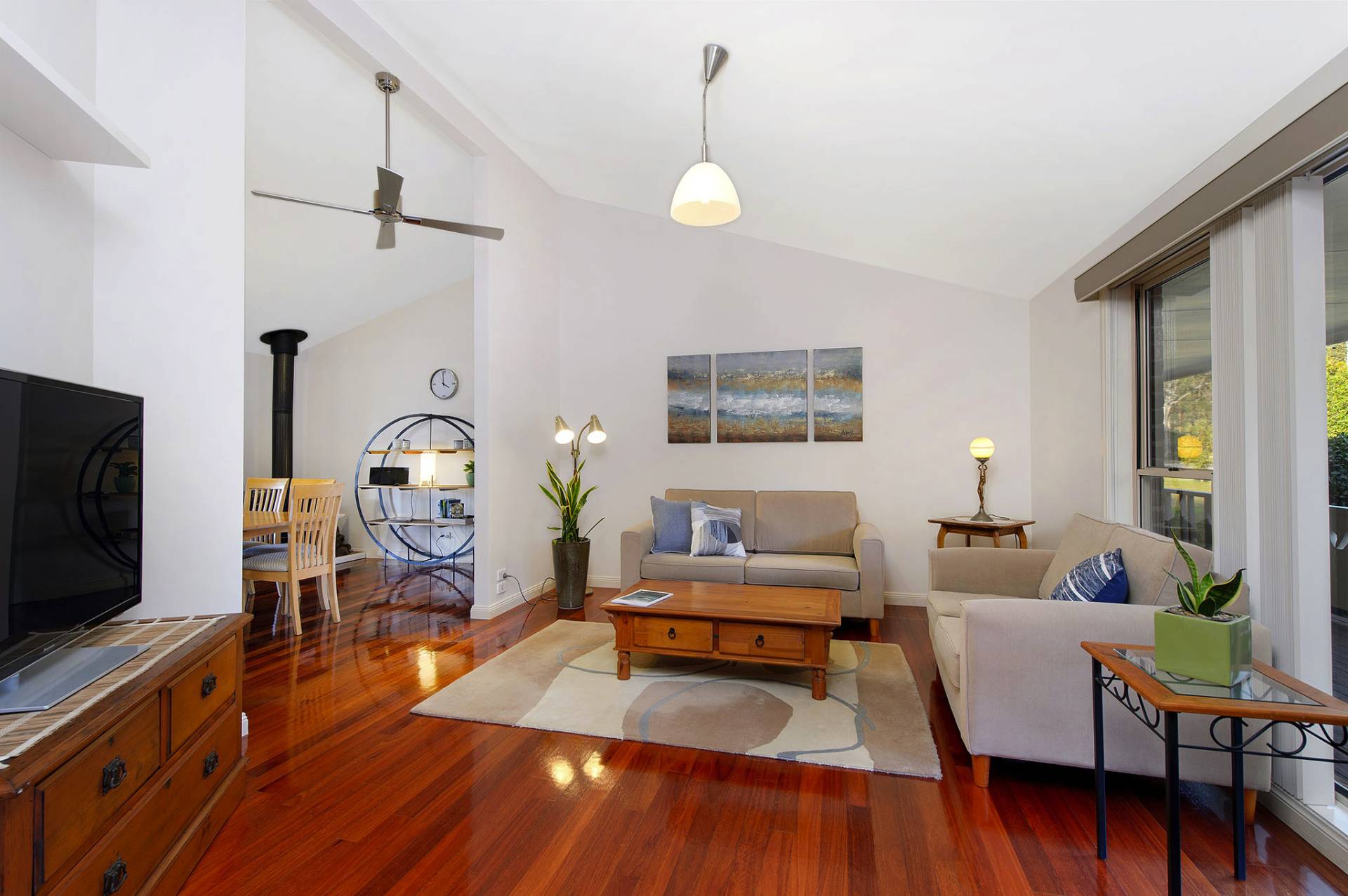 Gleaming Rosegum floorboards combined with a vaulted roofline feature throughout the living, kitchen and dining zone.