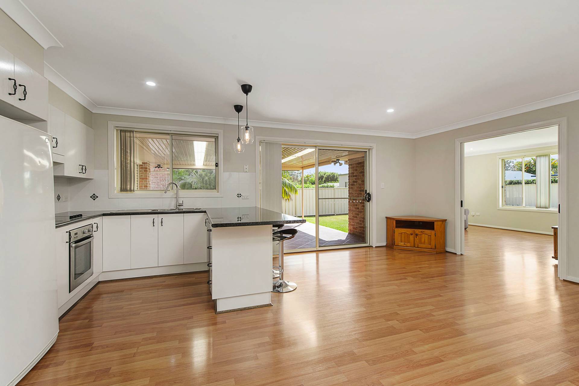 Light and bright throughout, there are sliding doors from the family zone that open onto a covered entertaining area and the level rear garden.