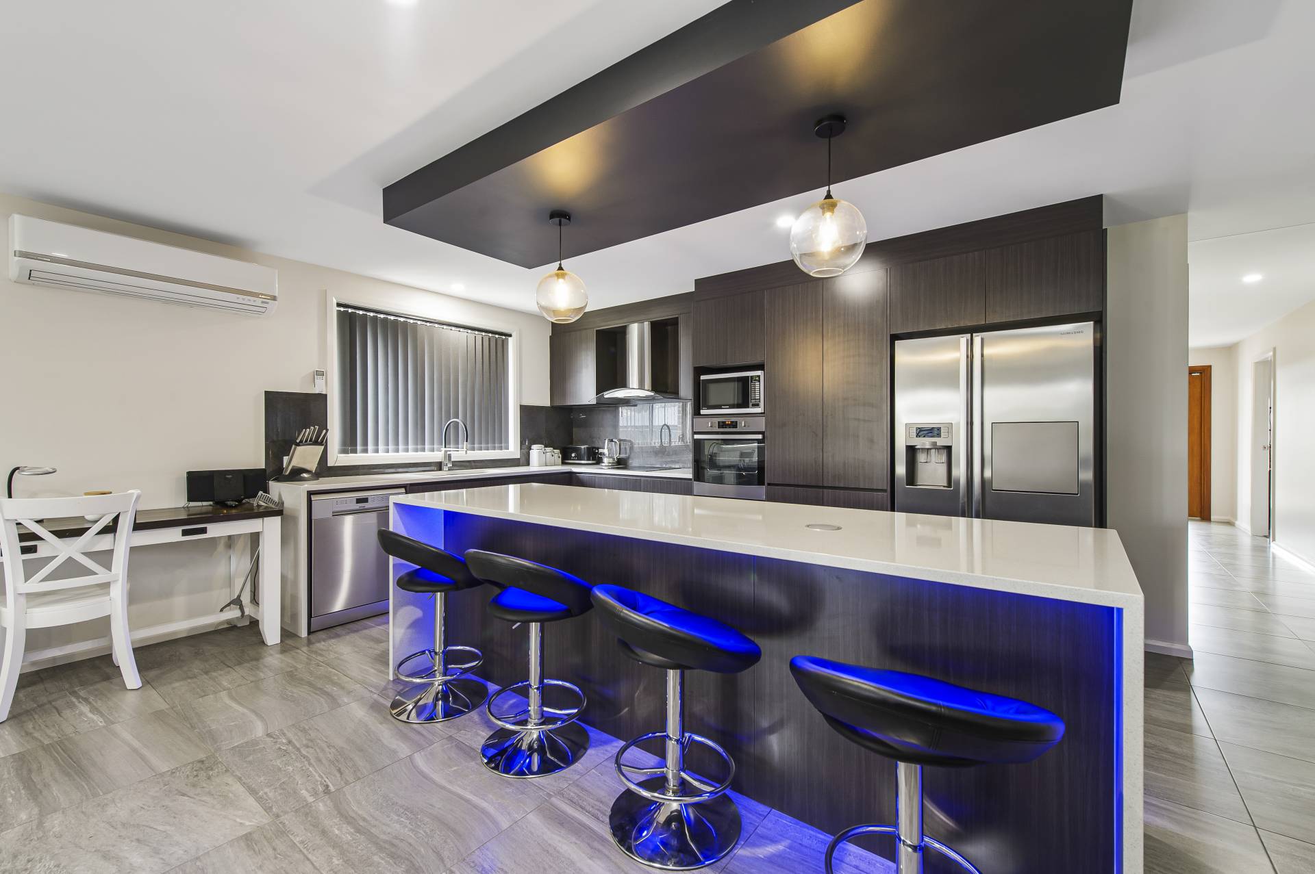 The kitchen features stone benchtops with waterfall edge on the island bench, plumbed in double fridge and feature lighting.