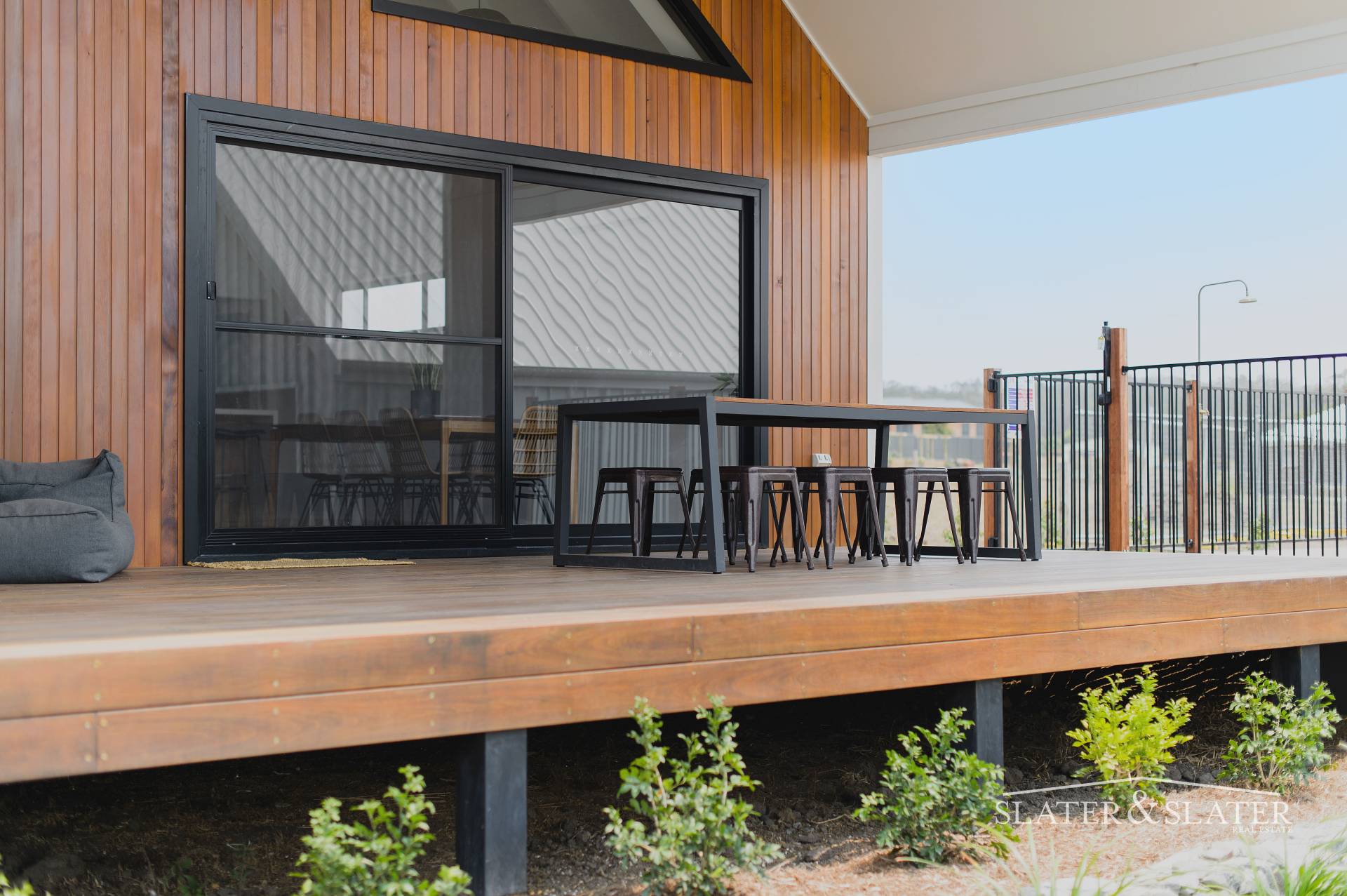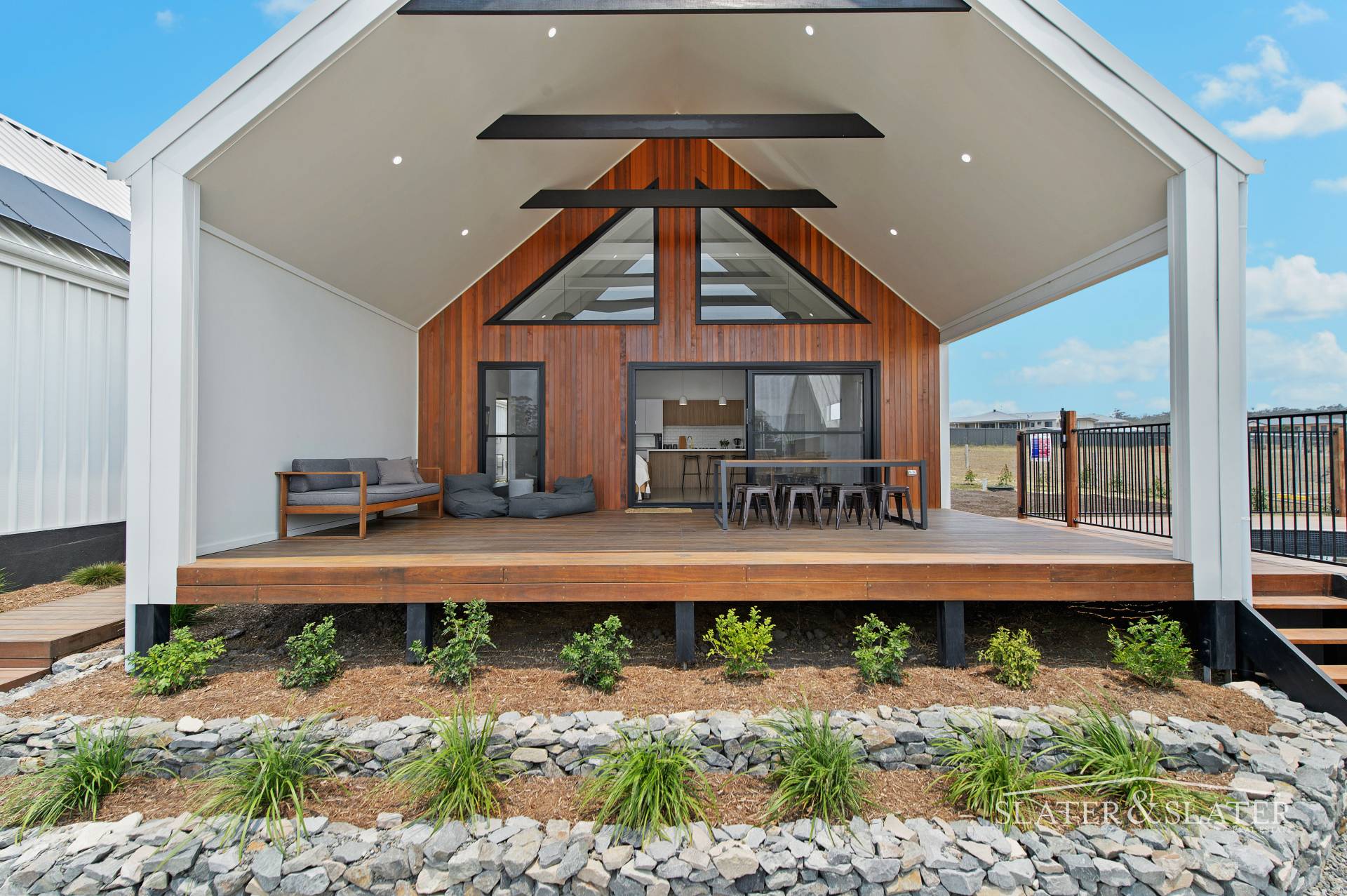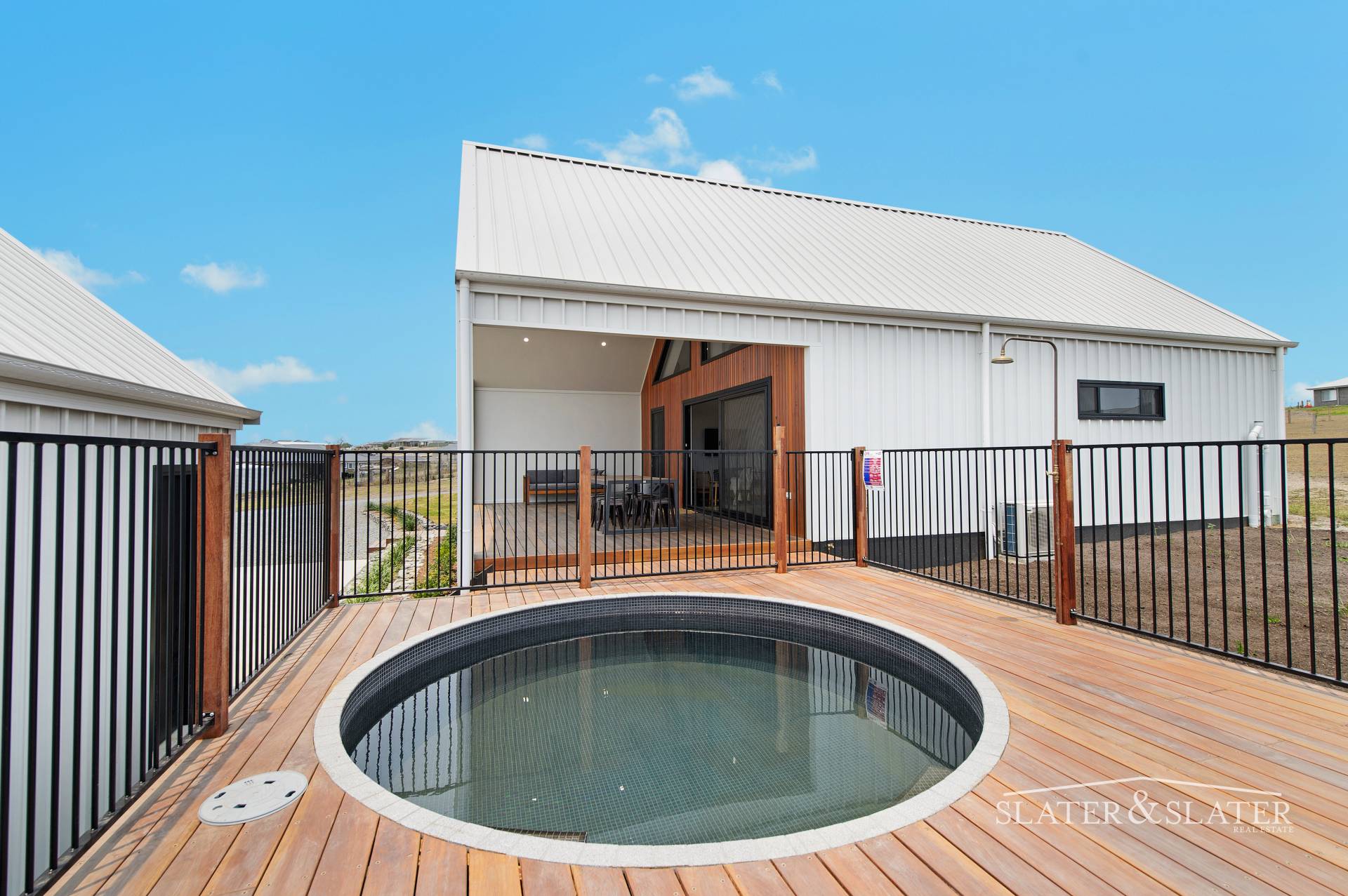 This zone flows out through large sliding doors to a covered timber deck that extends to a circular plunge pool with outdoor shower.