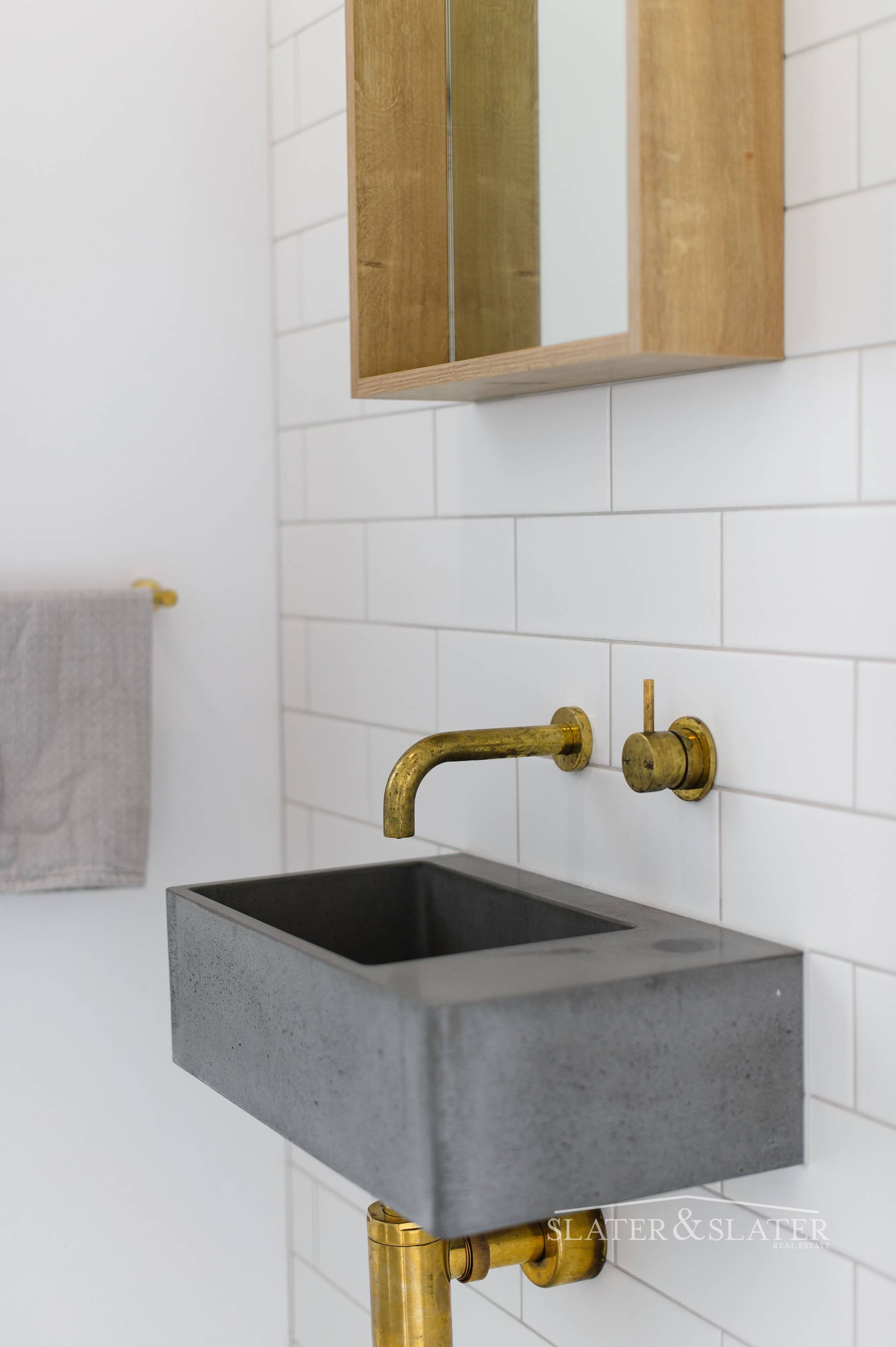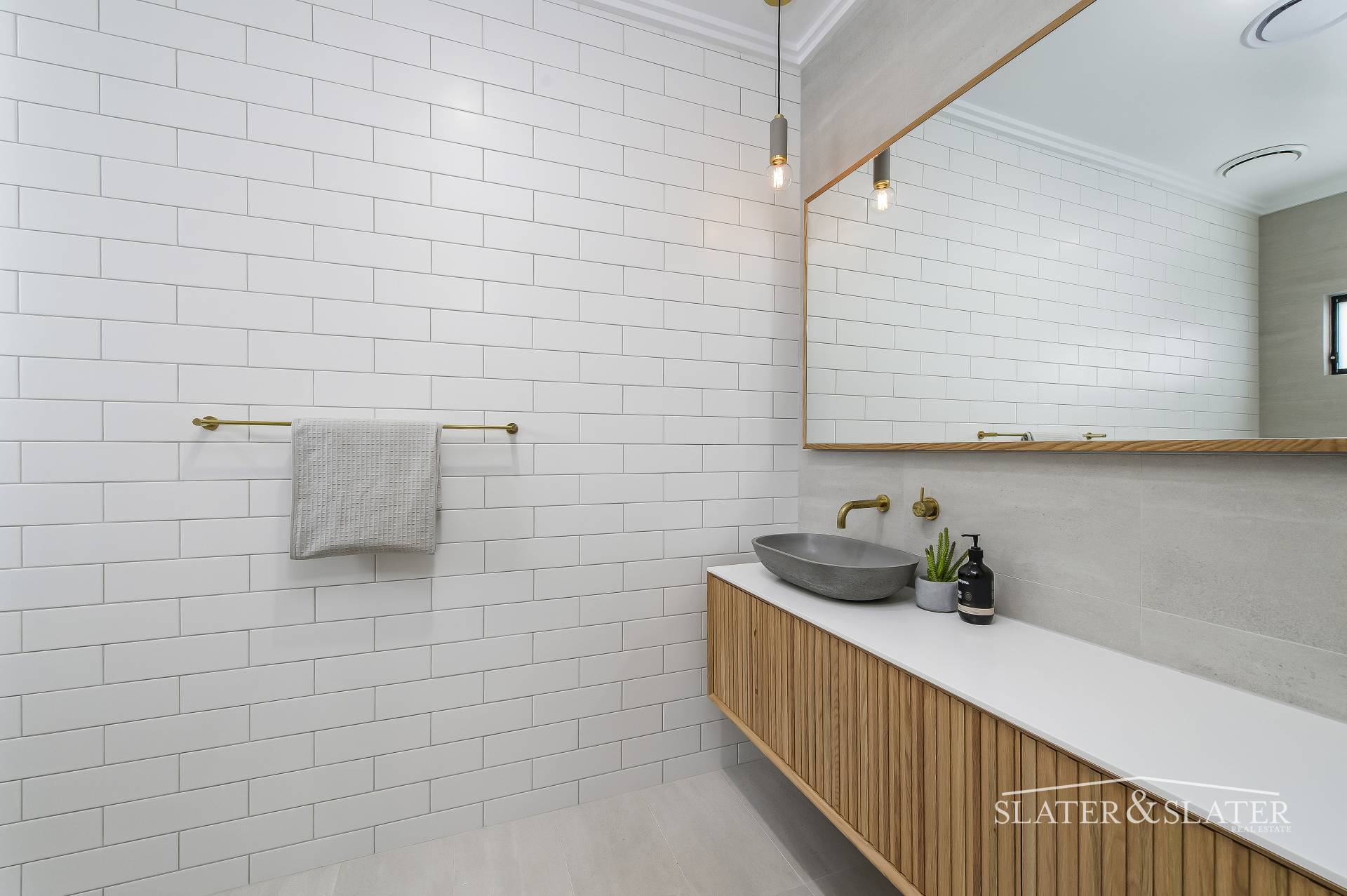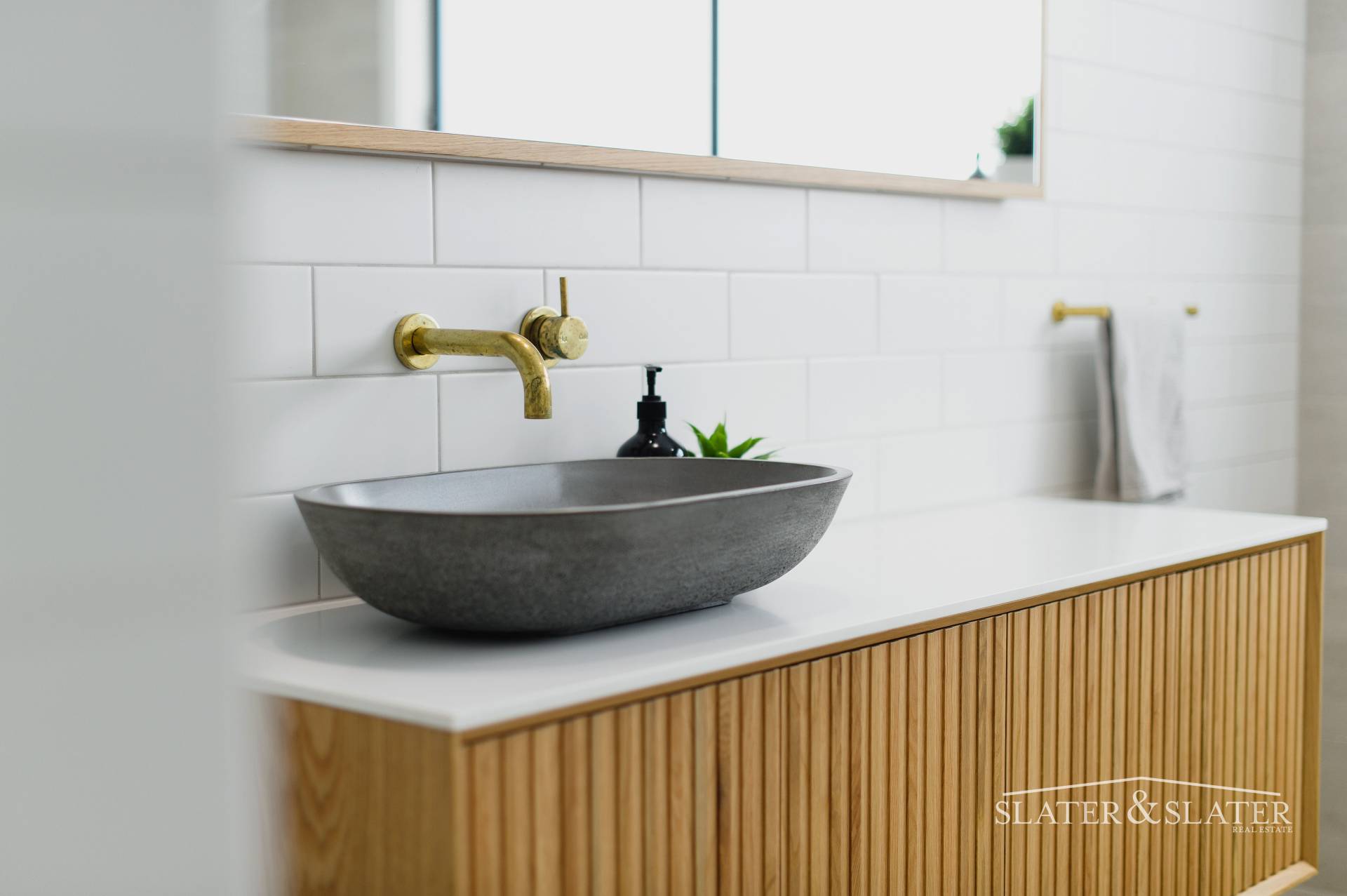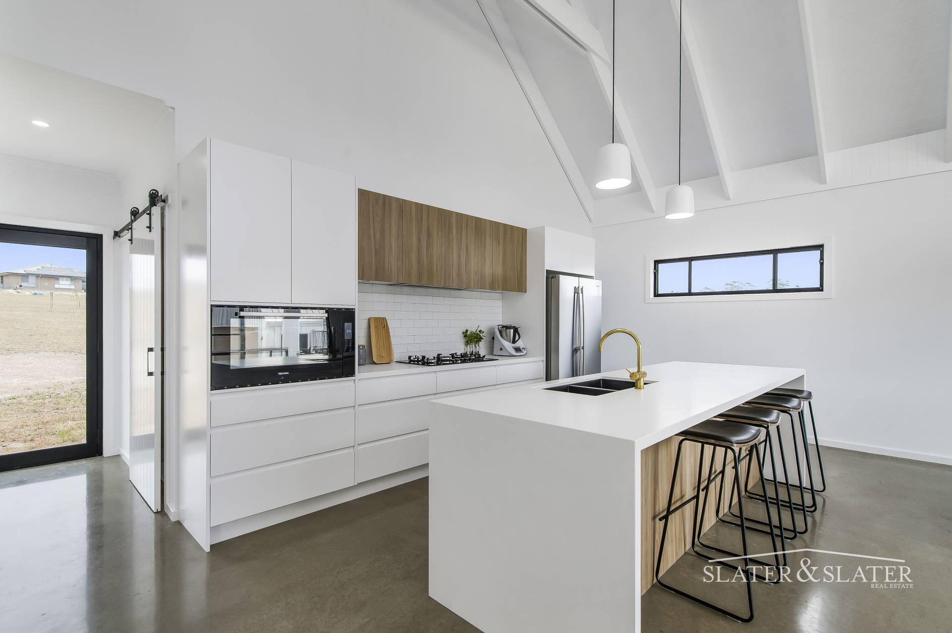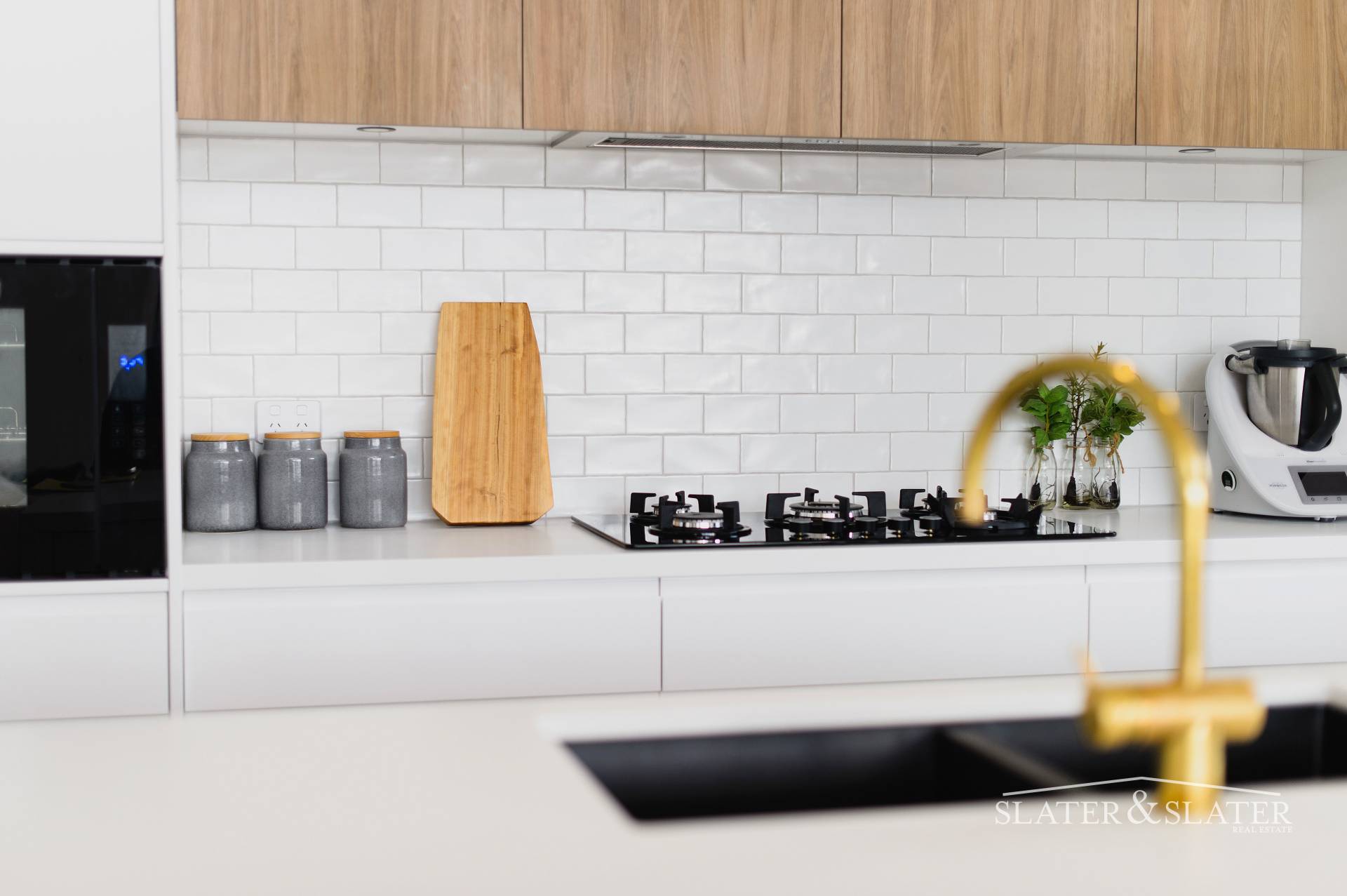 The floorplan is created from two distinct zones that are joined by a connecting breezeway. The living, dining and kitchen zone includes a generous walk-in pantry, laundry and powder room. The sleek kitchen enjoys expansive caesar stone benchtops, five burner stove top, 900mm electric oven and black stone sink with living tumbled brass tapware and fittings.