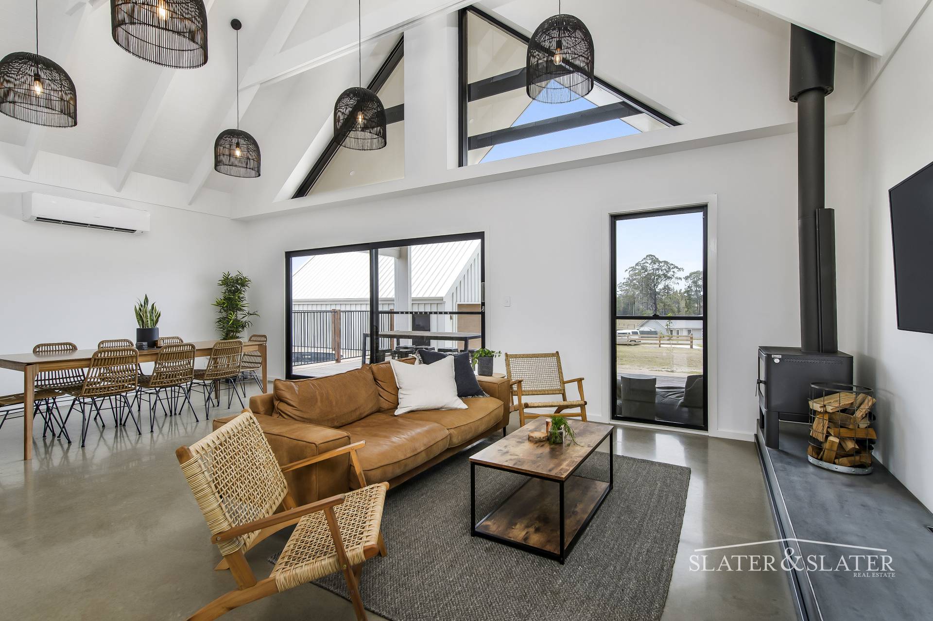 Air conditioner Ducted airconditioning system Undercover outdoor area Fireplace Inground pool Plantation shutters throughout Sound proofing in bedrooms Town water 3,000 litre water tank Mezzanine area in shed 3.5m diameter plunge pool Timber deck Polished concrete floor Bespoke concrete sinks Living tumbled brass tapware 5.4kw solar system with 20 pan