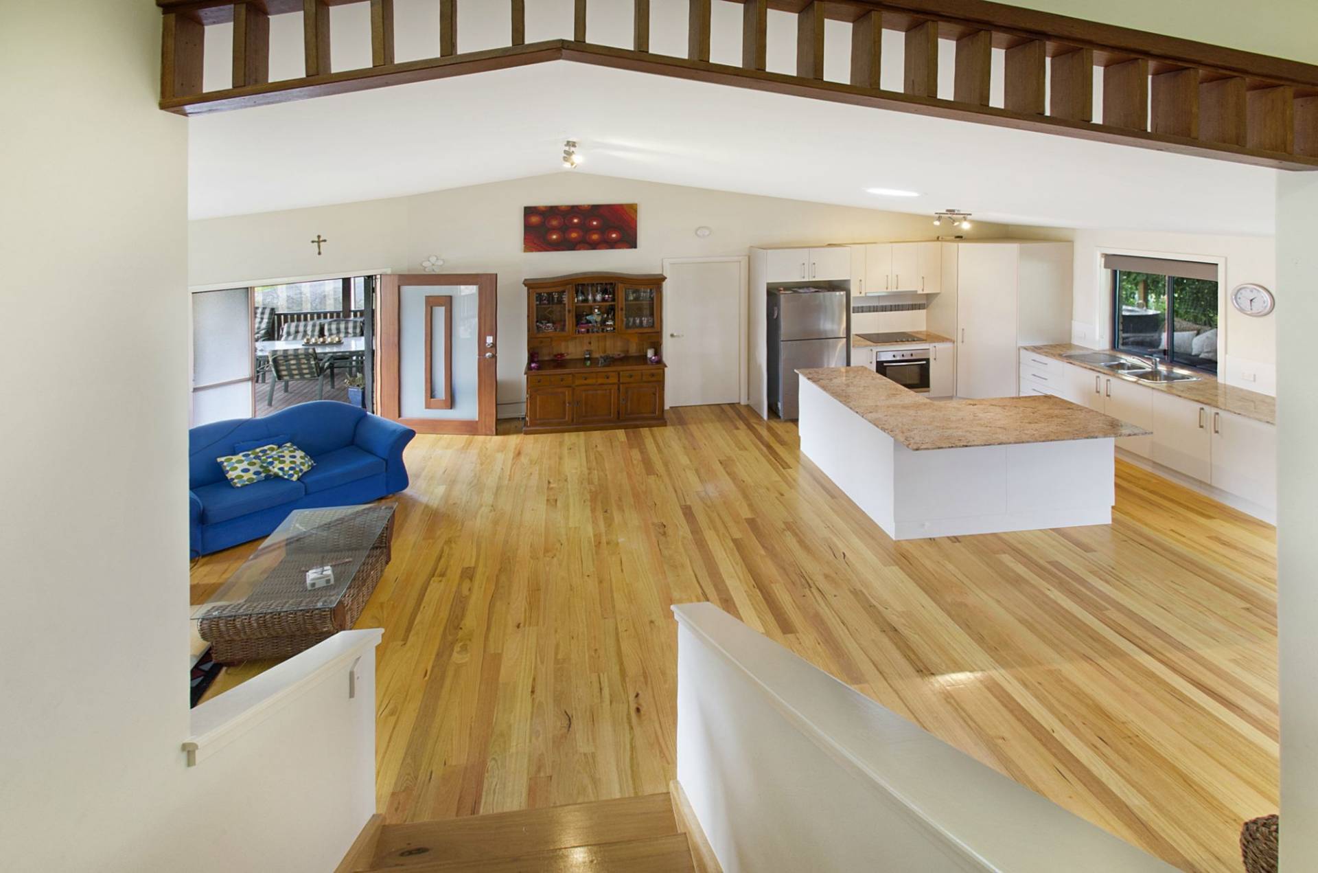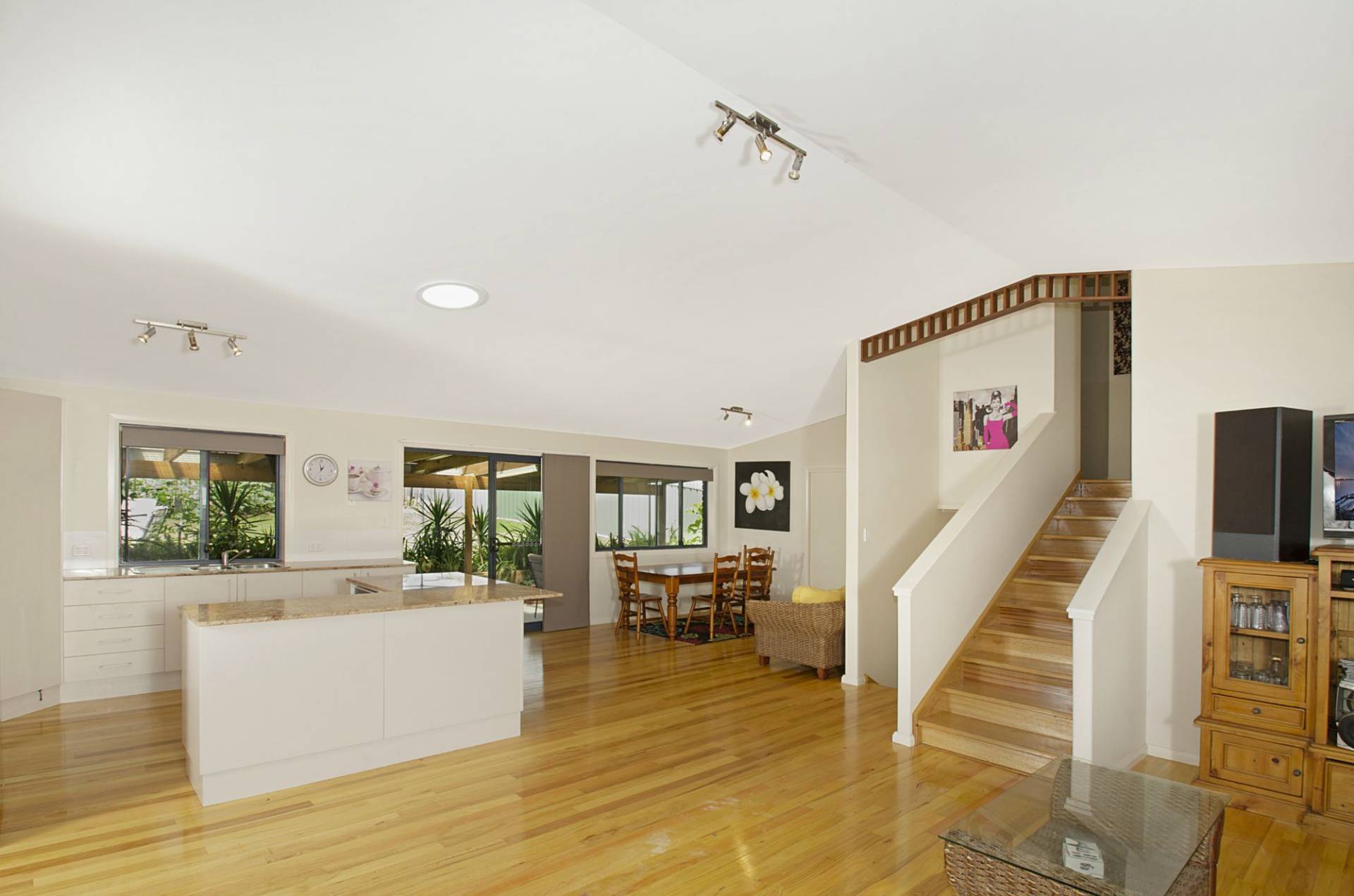 Spread across three levels, steps lead up from the double garage into the substantial open plan kitchen, living and dining area that enjoys vaulted ceilings, wooden floorboards and plenty of natural light.