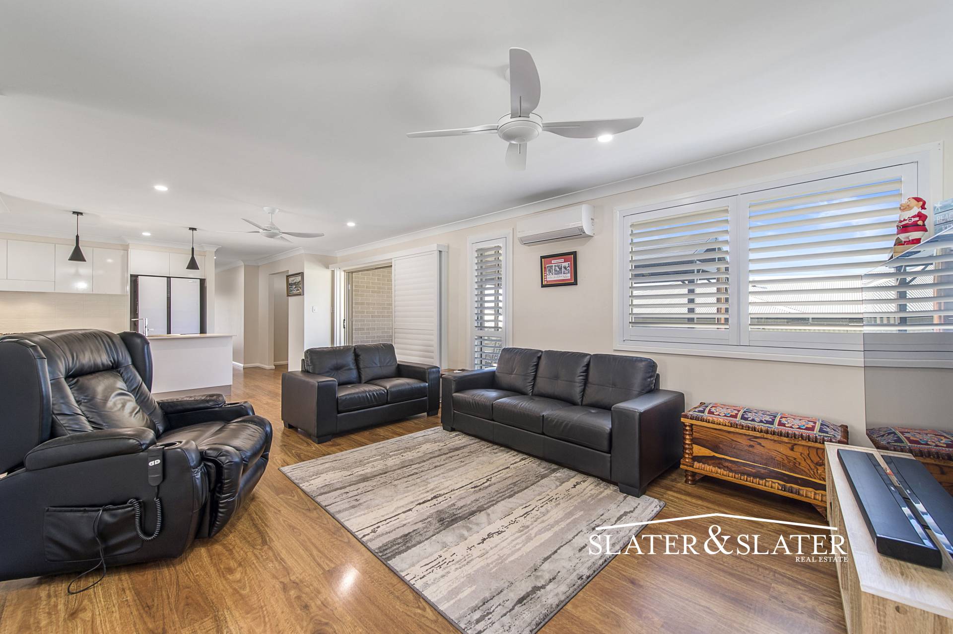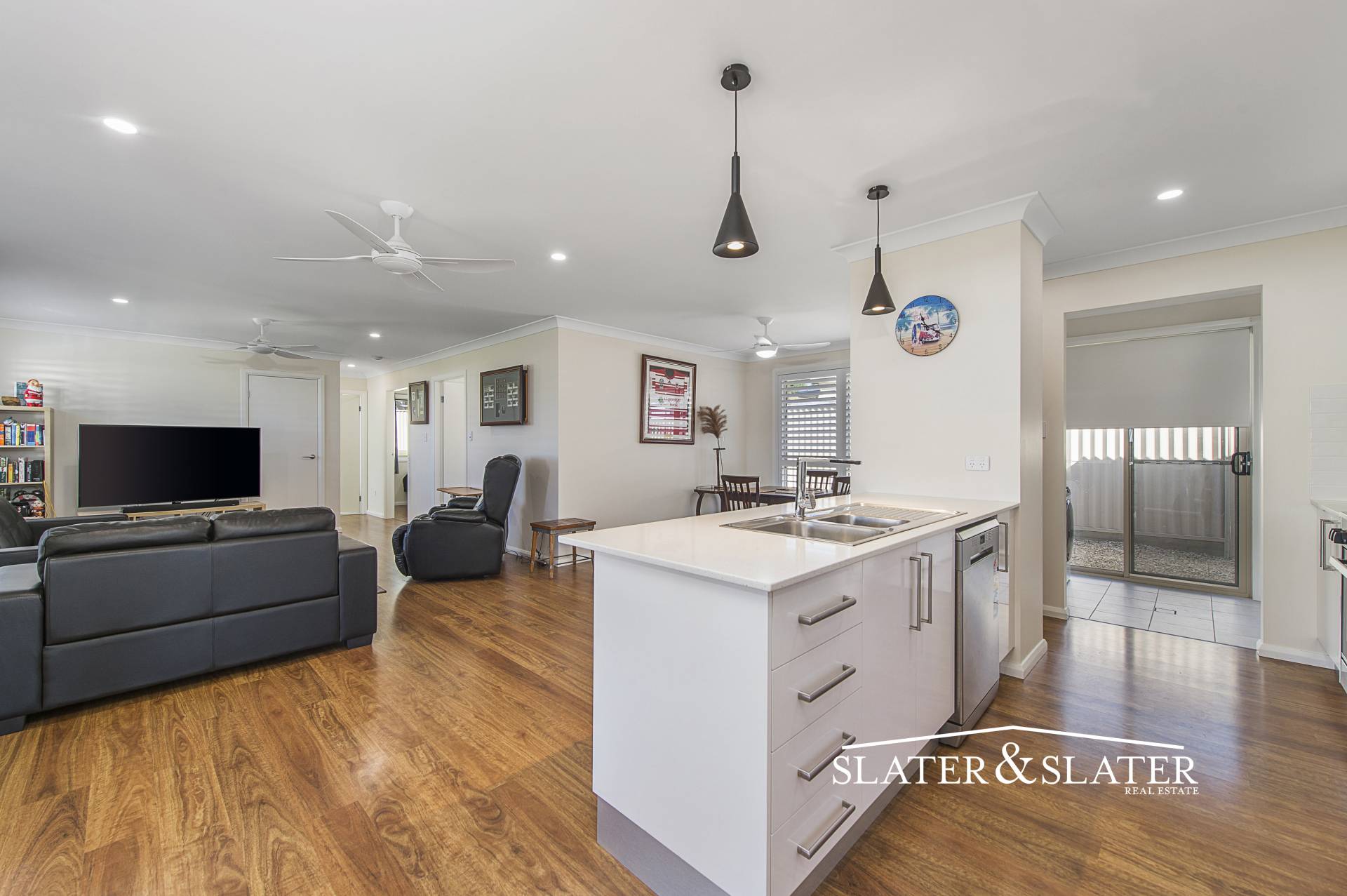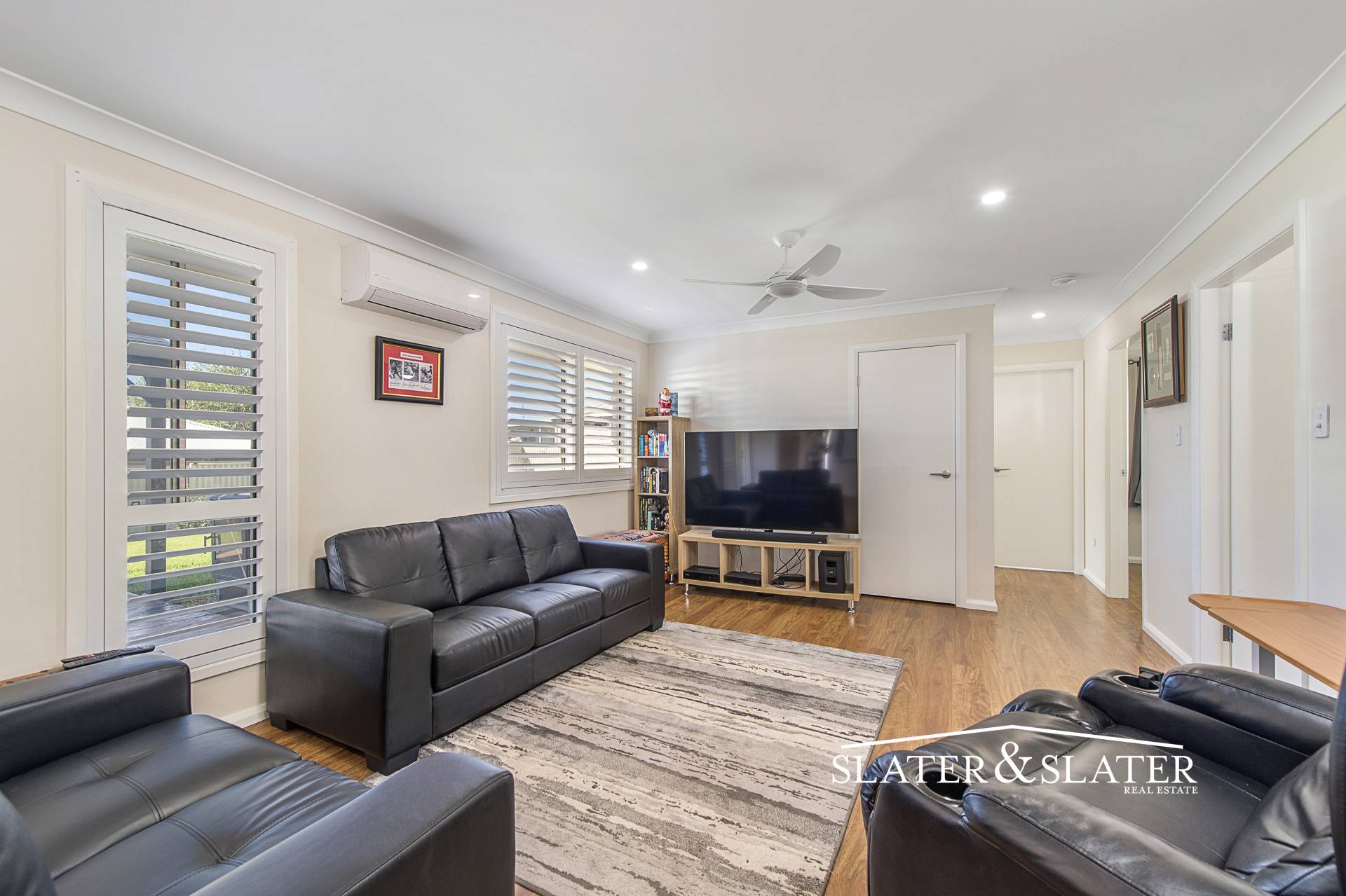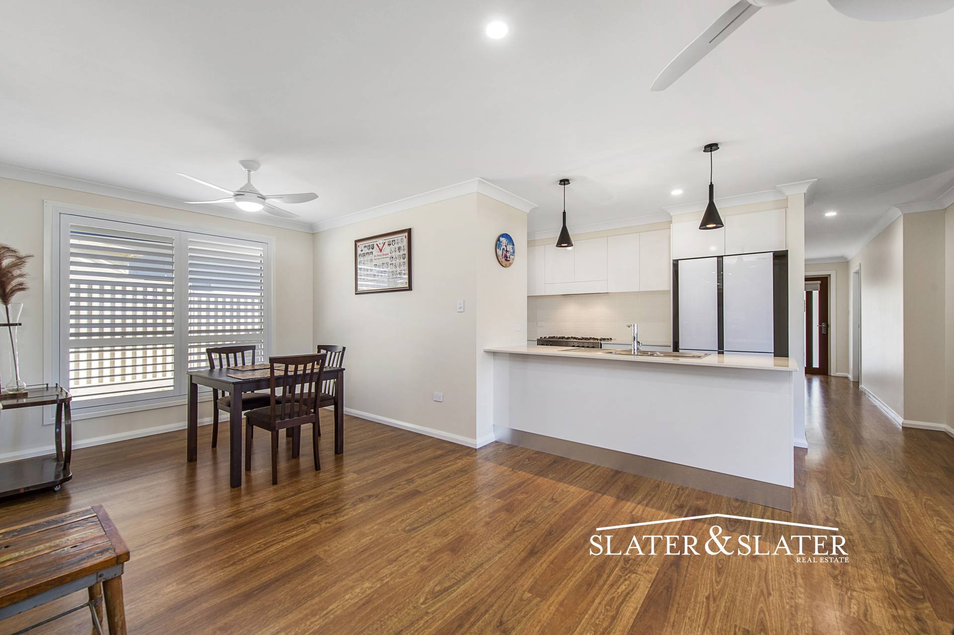 Timber floating floors have been installed throughout and there are plantation shutters on all the windows down one side of the home.