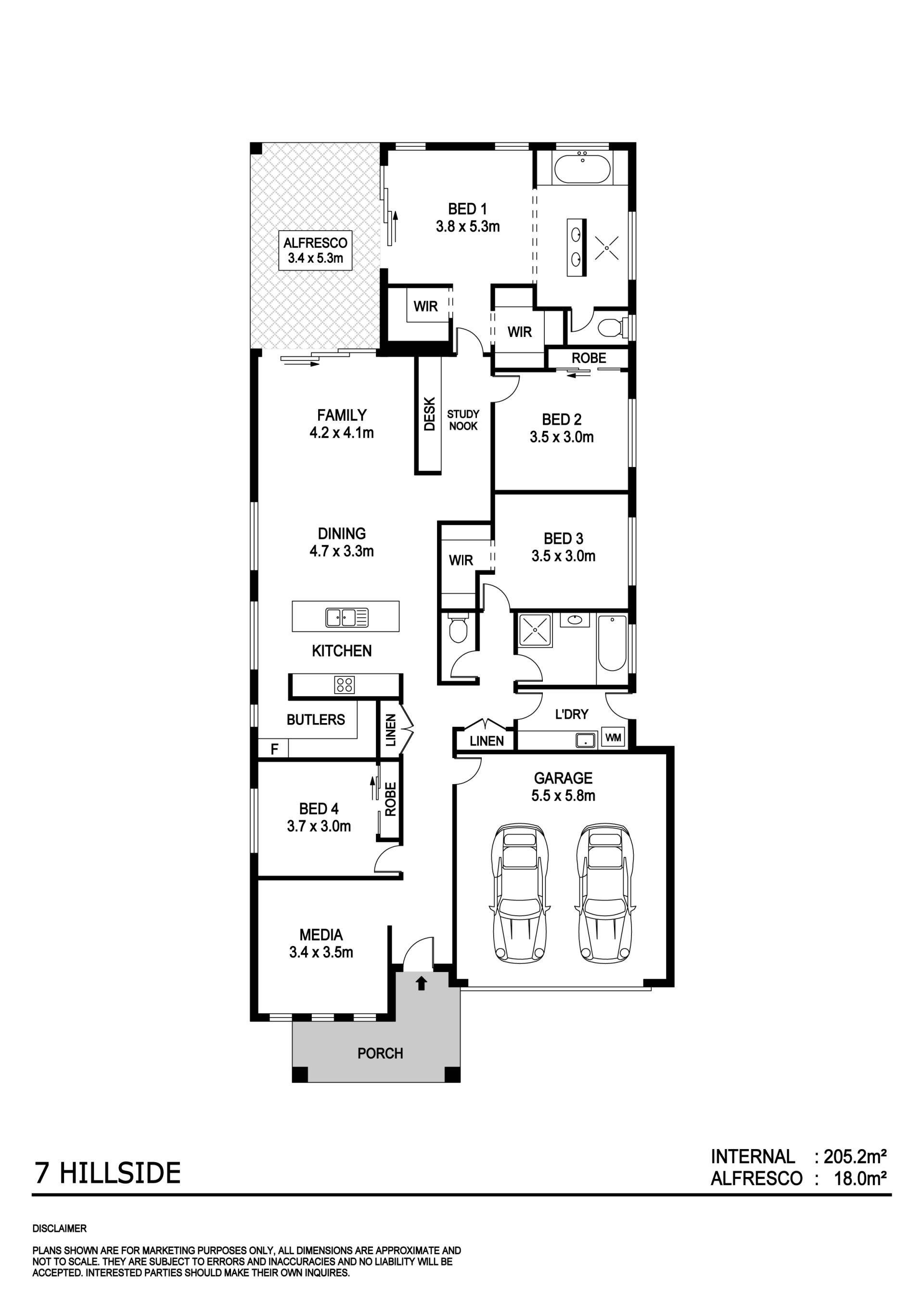 Side access, space for a pool and shed, ducted heating and cooling system, Quartz benchtops in kitchen and butler's pantry, dedicated study nook, media room, rangehood, dishwasher, ceiling fans, two baths, substantial sized ensuite and walk in robe, undercover alfresco area.
