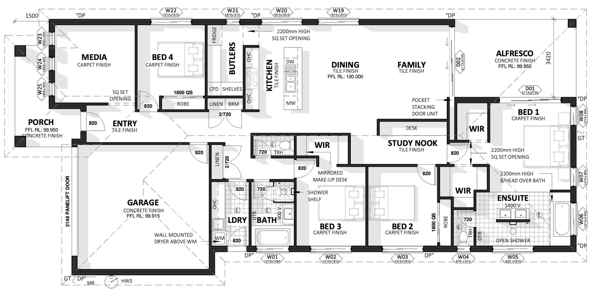 The custom-built extra wide front door provides a sense of entrance to the flowing floorplan with bedrooms spaced throughout to provide privacy to each room.