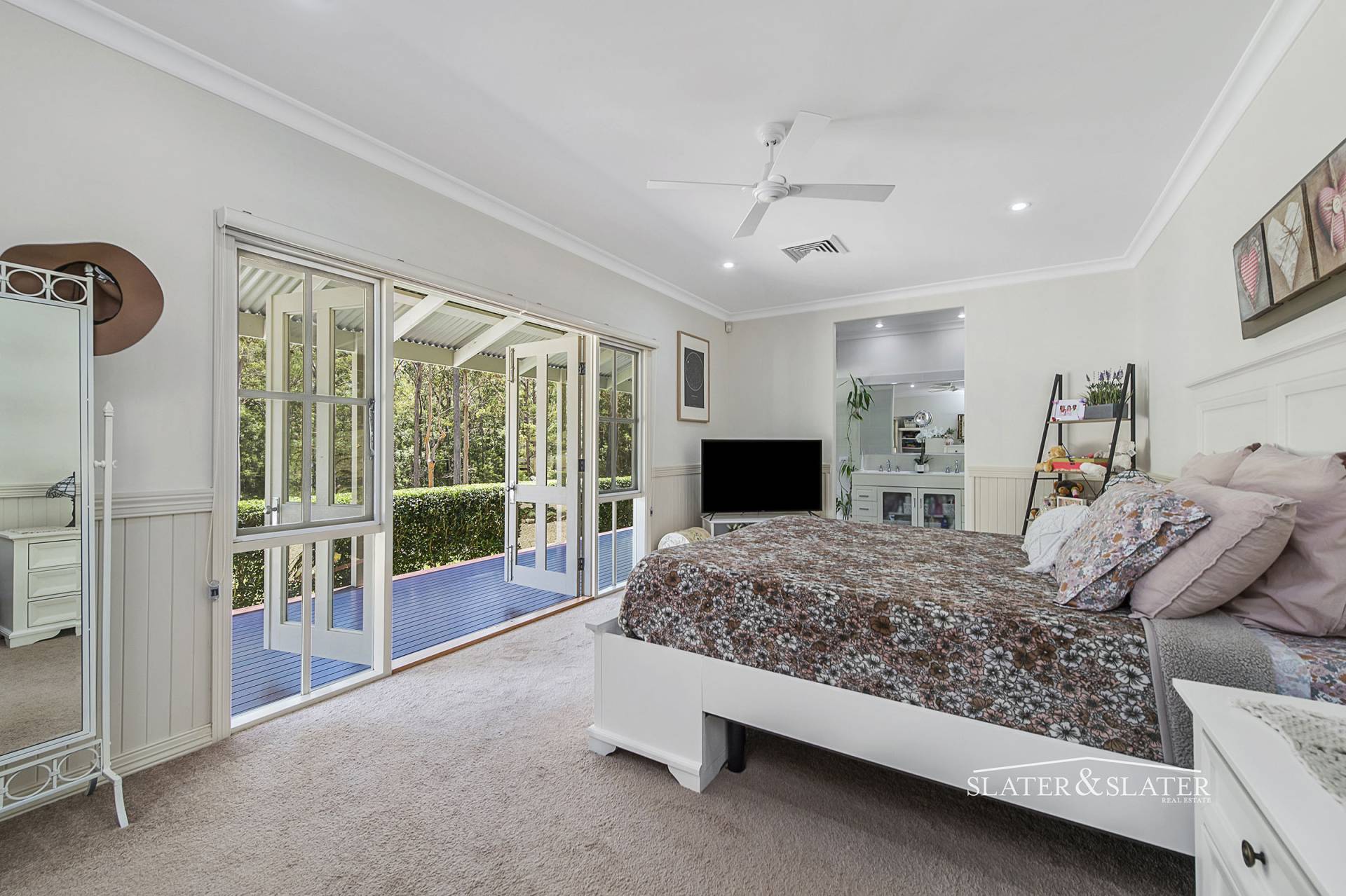 Located separately to the other bedrooms is the main bedroom suite that enjoys a peaceful outlook toward the forest and features a set of French doors leading onto the verandah, a stylish ensuite with double vanities, separate spa bath and shower as well as a spacious walk-in wardrobe.
