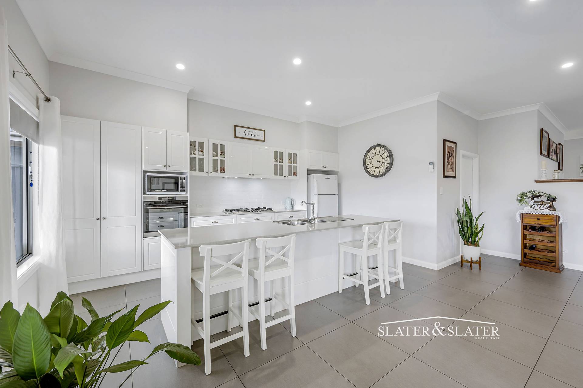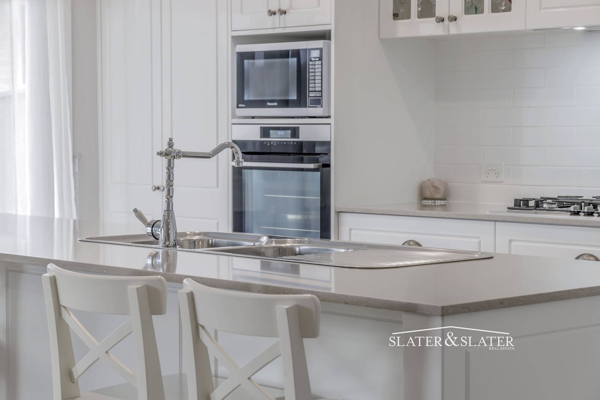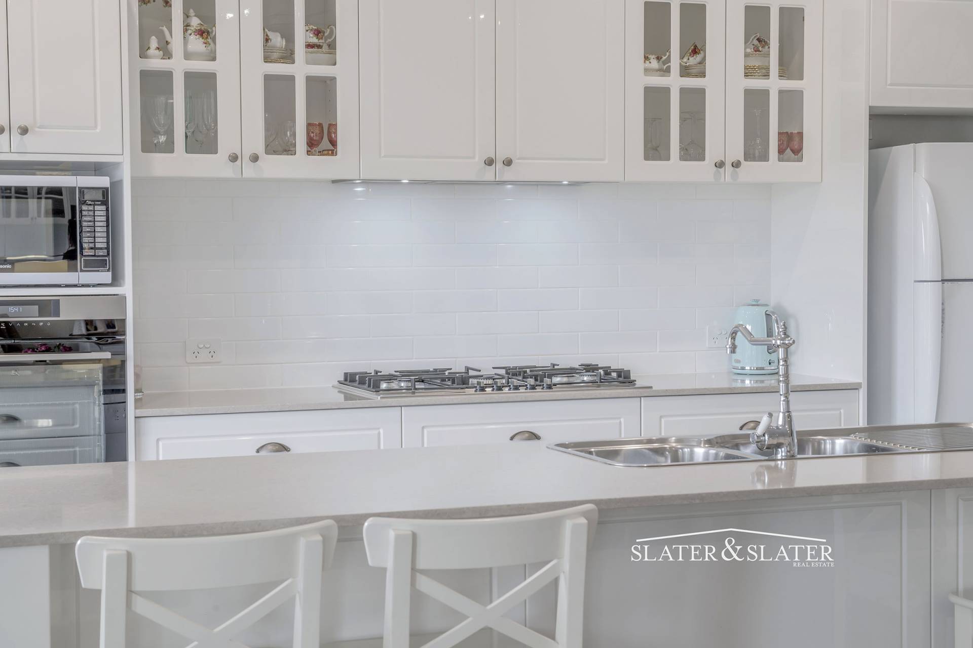 The Hamptons style kitchen which is flooded with natural light from the front window which looks out to the distant hills and features an island bench, five-burner gas stove top, French door pantry and caesar stone benchtops.