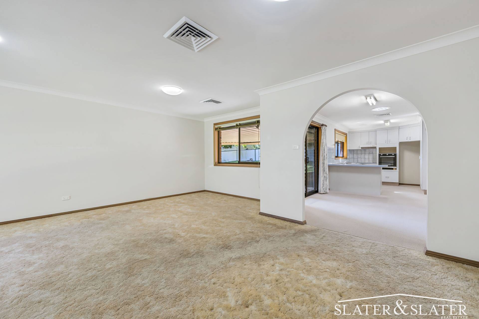 The large lounge room merges with the kitchen/dining area that opens through a sliding door to the undercover alfresco area, ideal for barbecues and outdoor living.