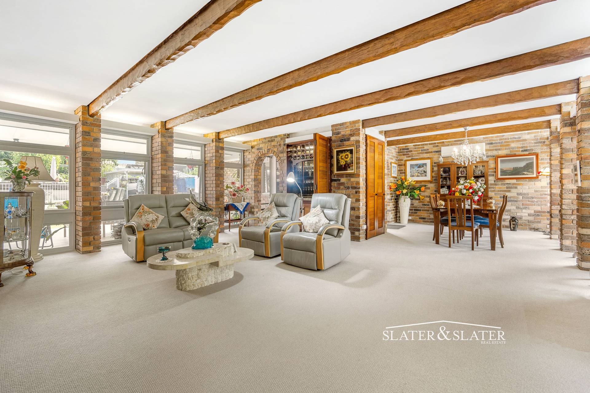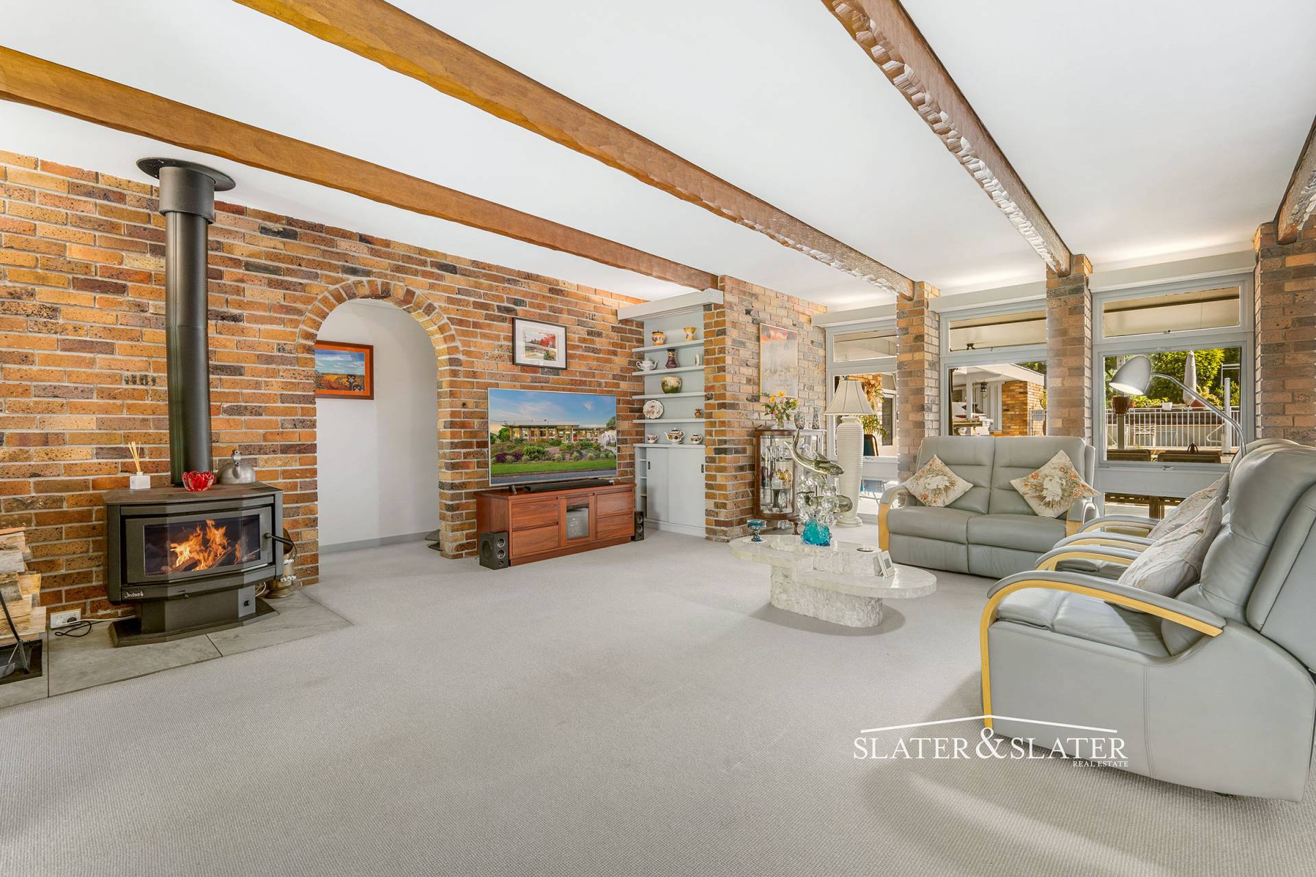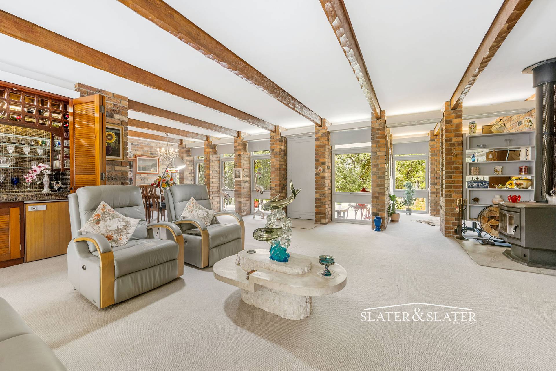 At the heart of the home is a generous air-conditioned living and dining zone that enjoys exposed timber beams, woodburner, discreet concealed lighting above the window alcoves, enclosed wet bar with fridge and wine rack and a good sized study/office nook.