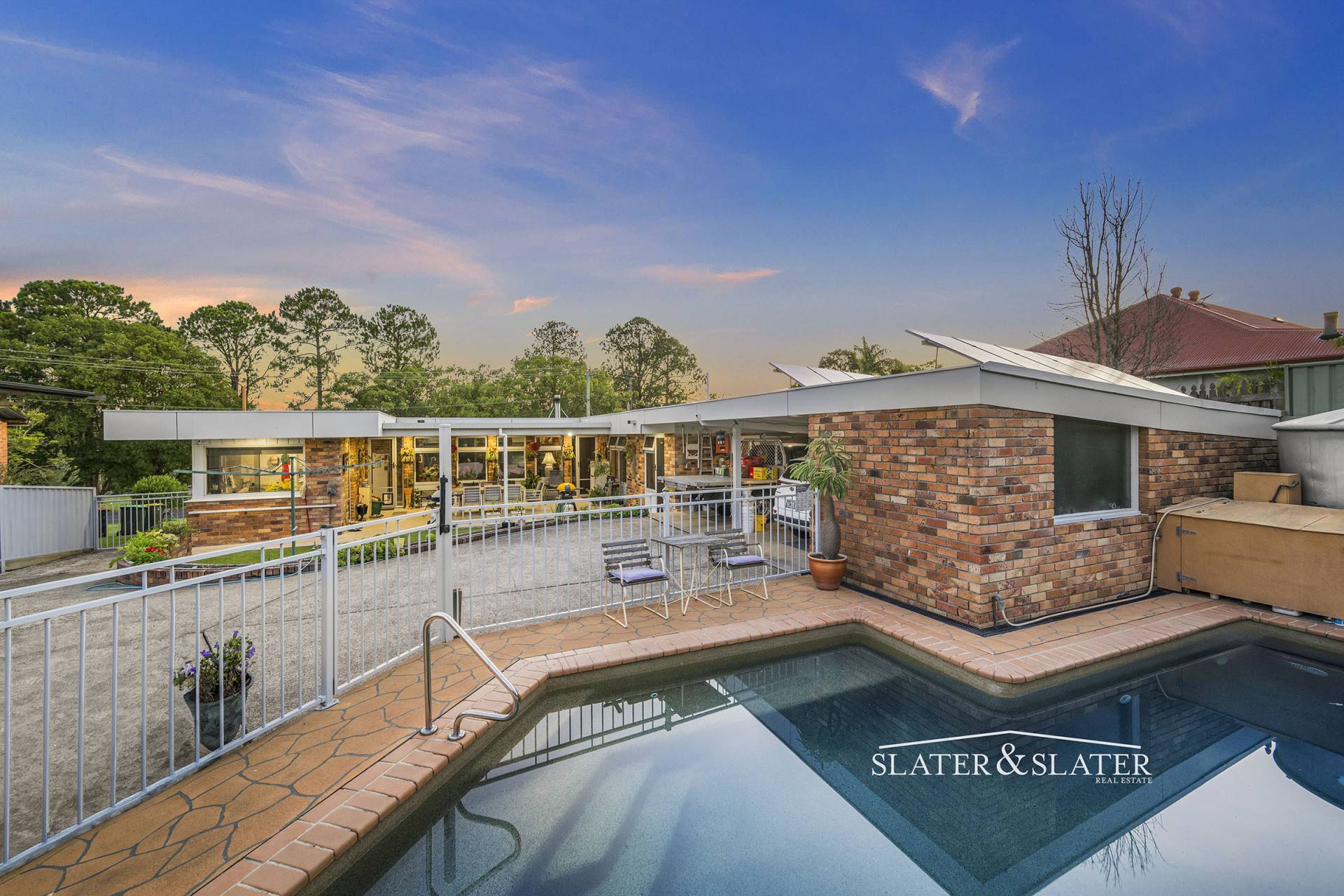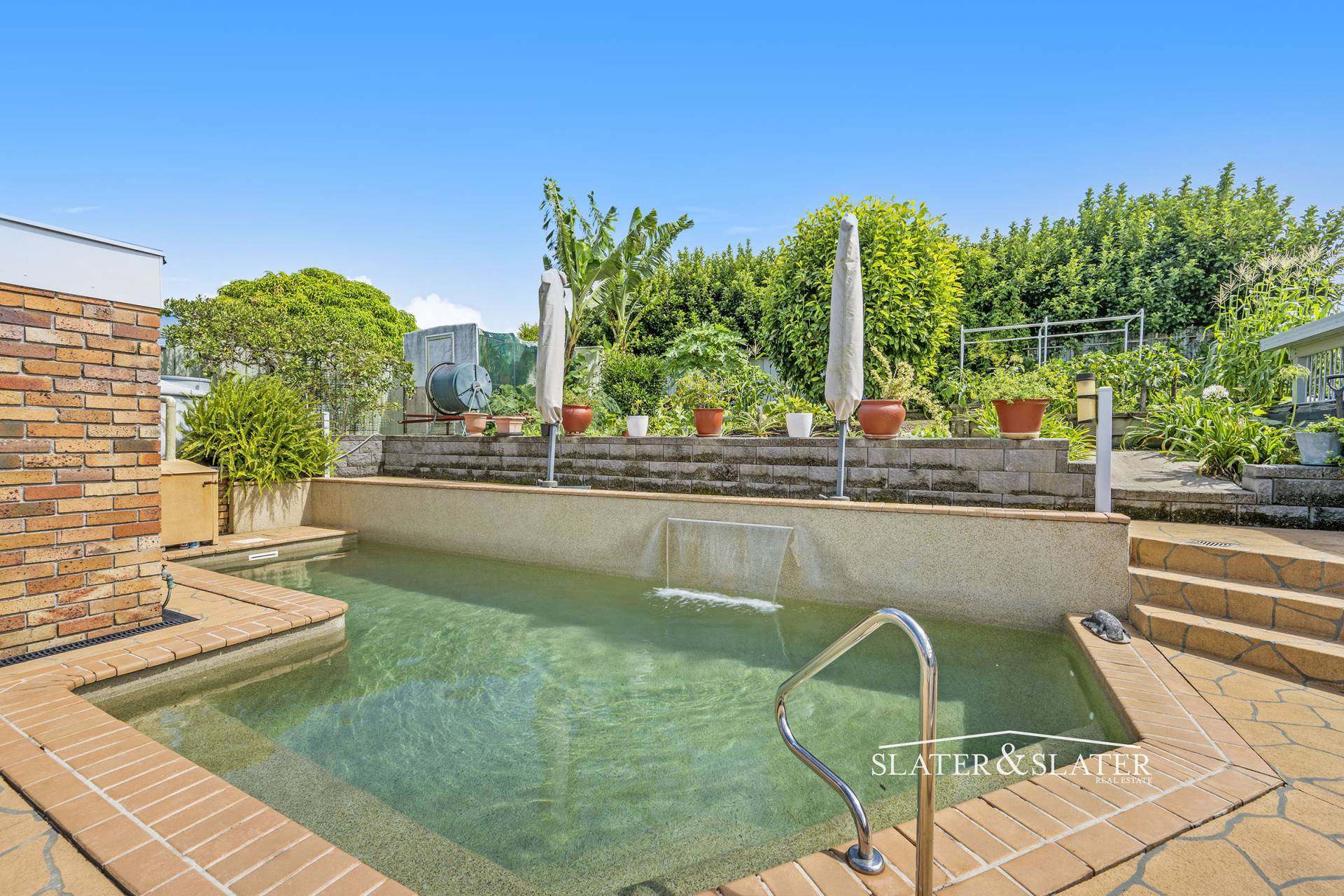 The rear part of the property also features three undercover vehicle spaces, workshop, large vegetable/fruit garden and a delightful compact swimming pool with fountain.