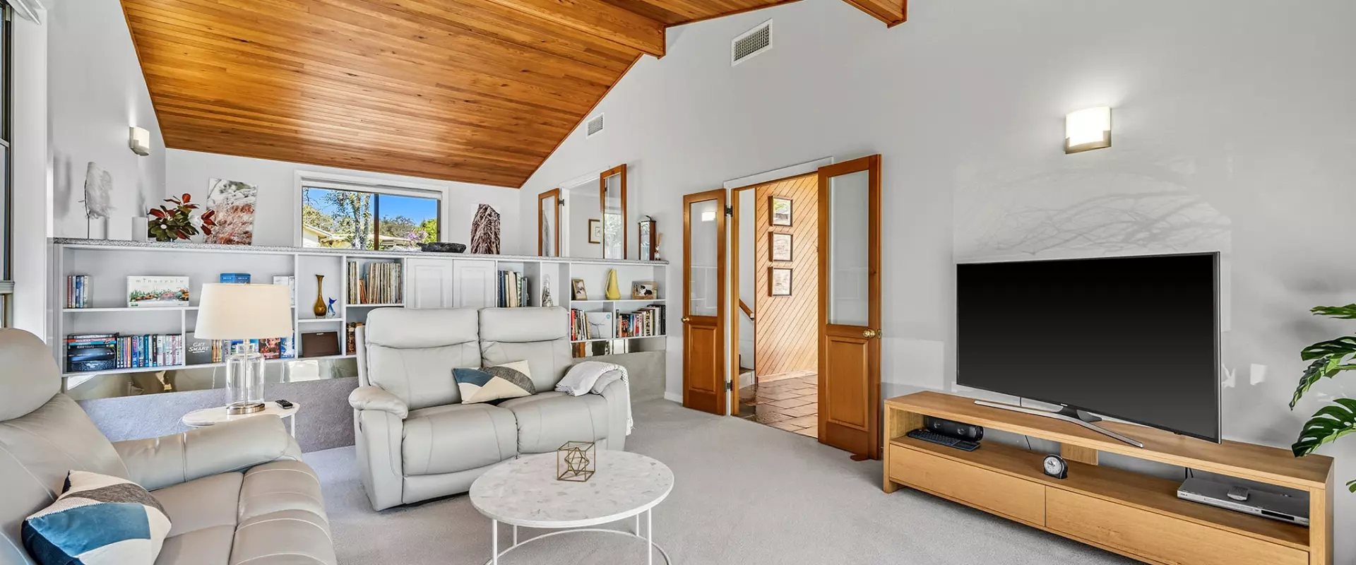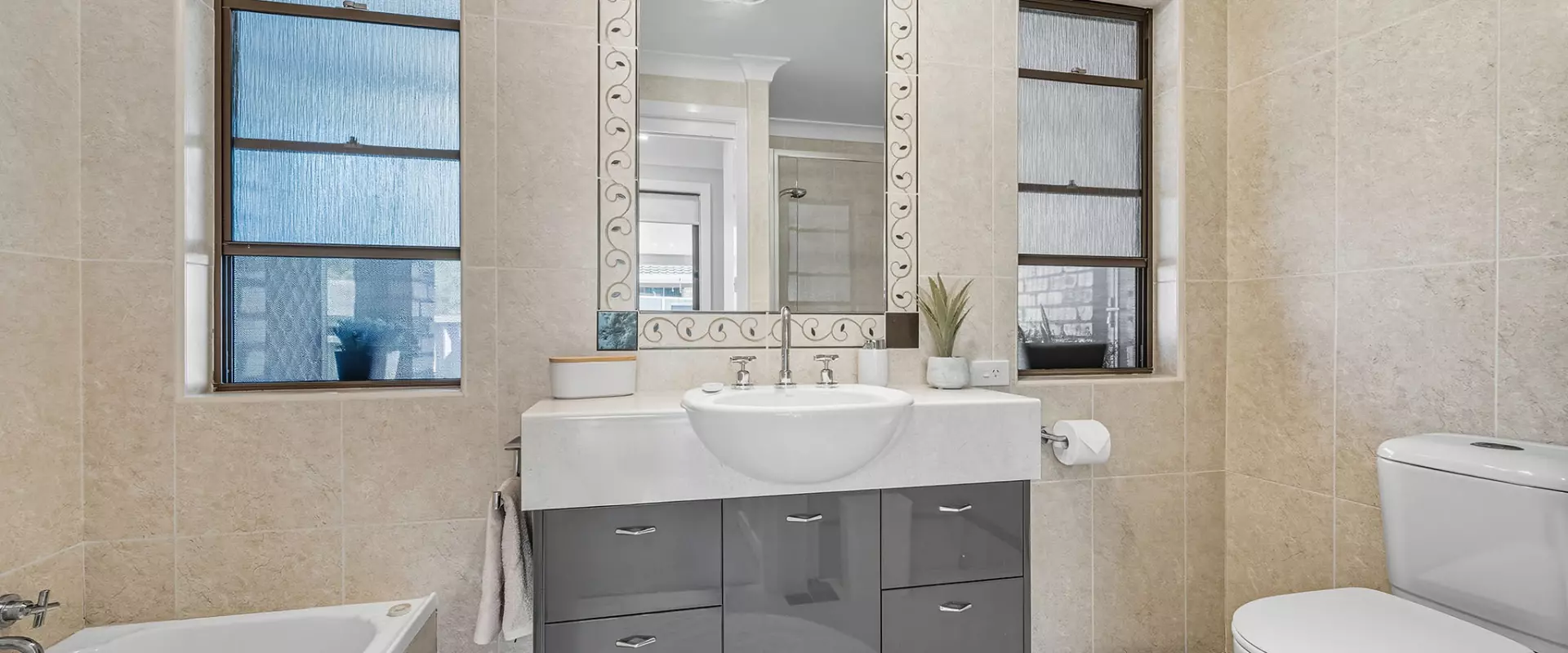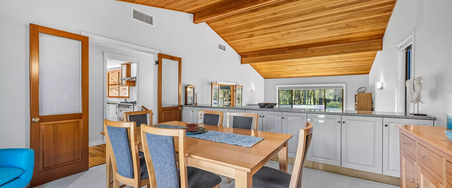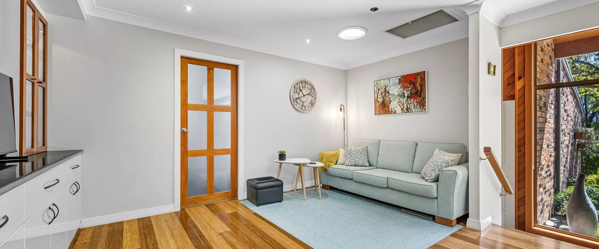 The primary bedroom has a sparkling ensuite and built-in wardrobes with a sliding door to outside. The other two bedrooms have built-in wardrobes and are serviced by the main bathroom with separate bath and shower. There is also a powder room with separate toilet and vanity.