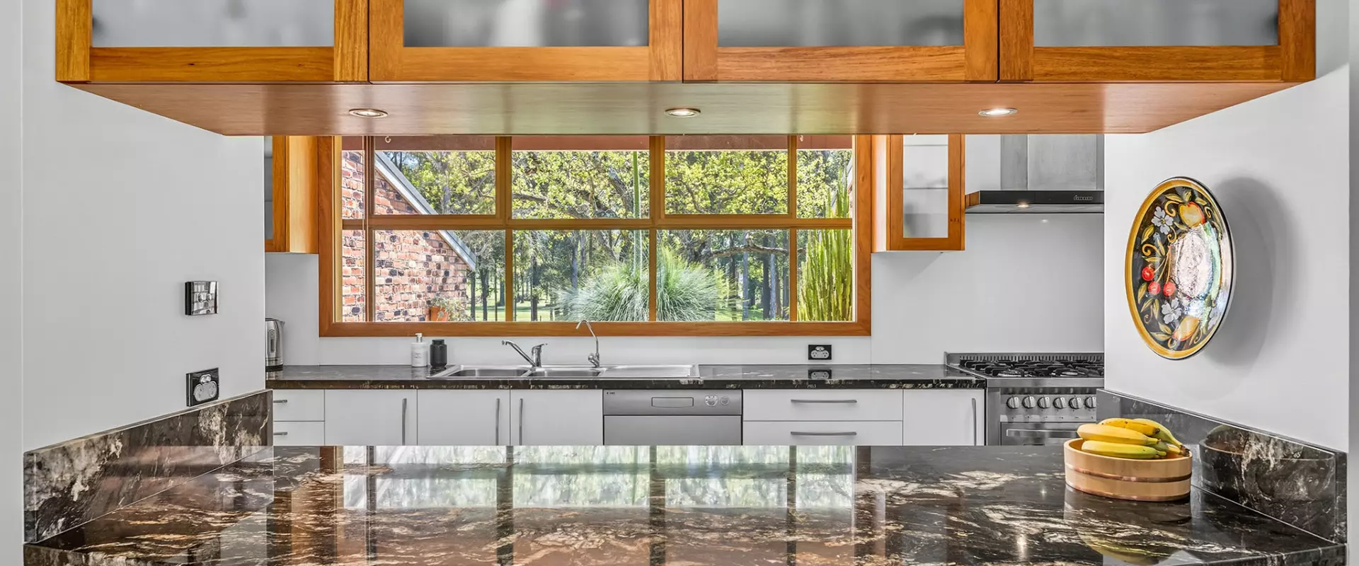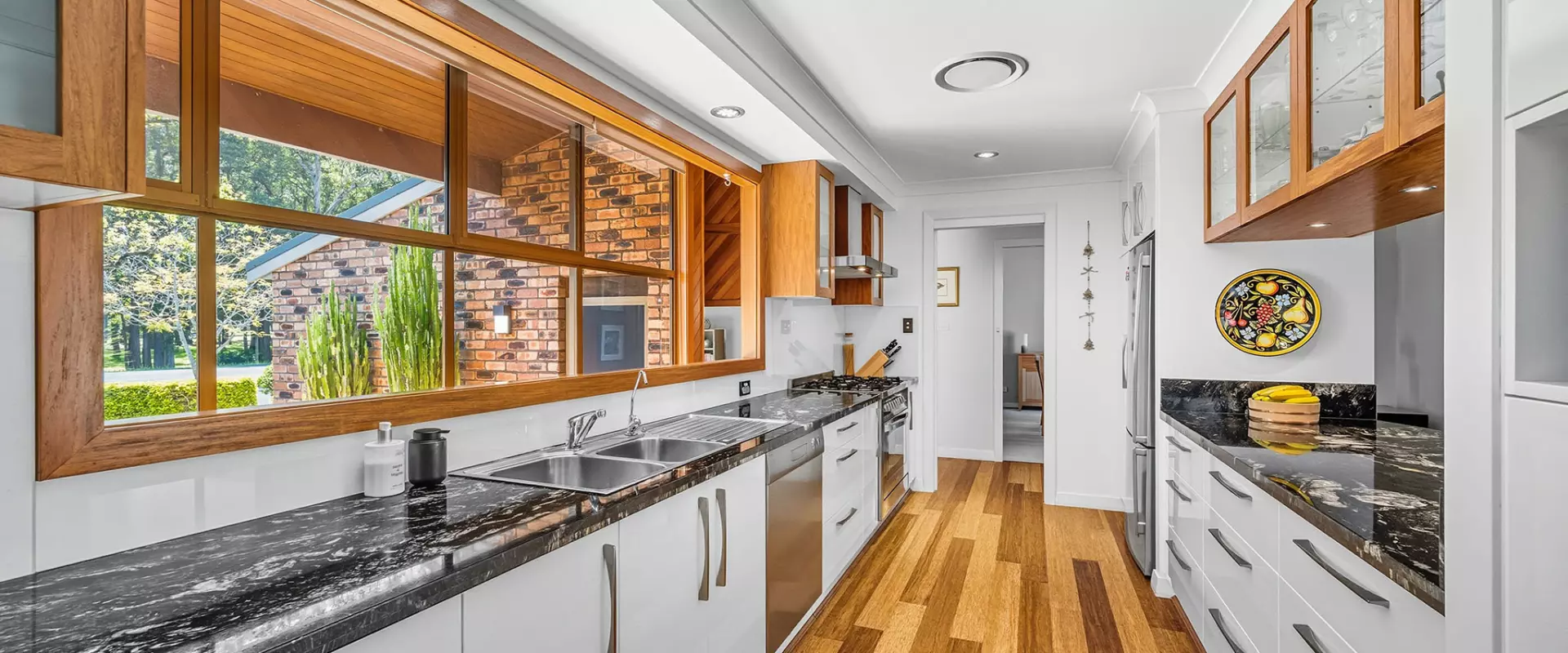 The kitchen has views across the front garden to the golf course and flows out via a sliding door to the rear covered entertaining area and pool.