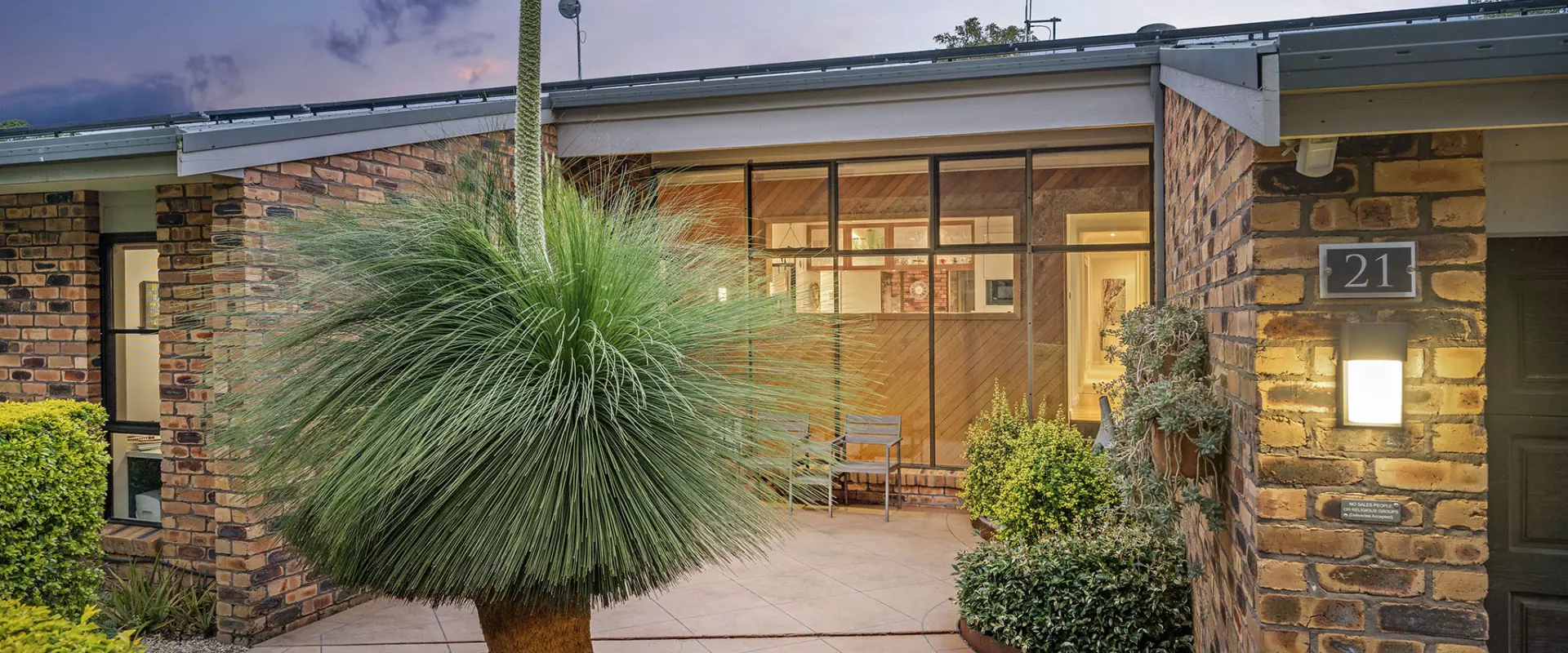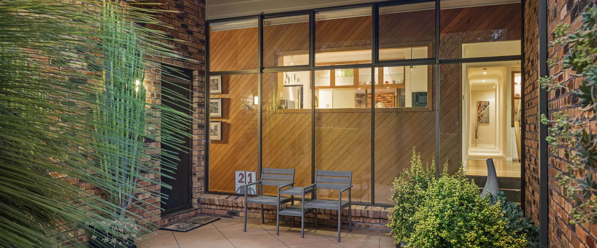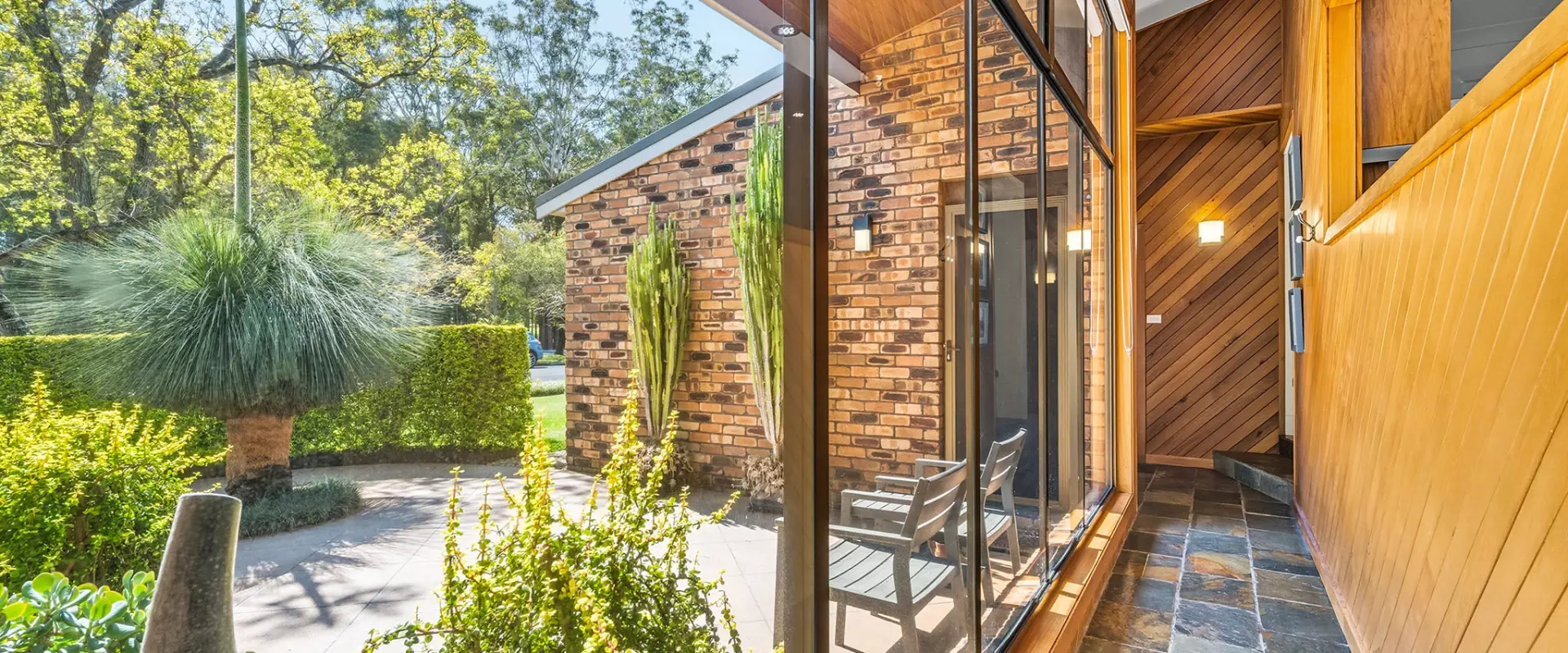 The entrance to the home sets the scene with an impressive Chinese Tallow tree and enchanting courtyard enjoyed from the inside by full length glazing at front of the house.