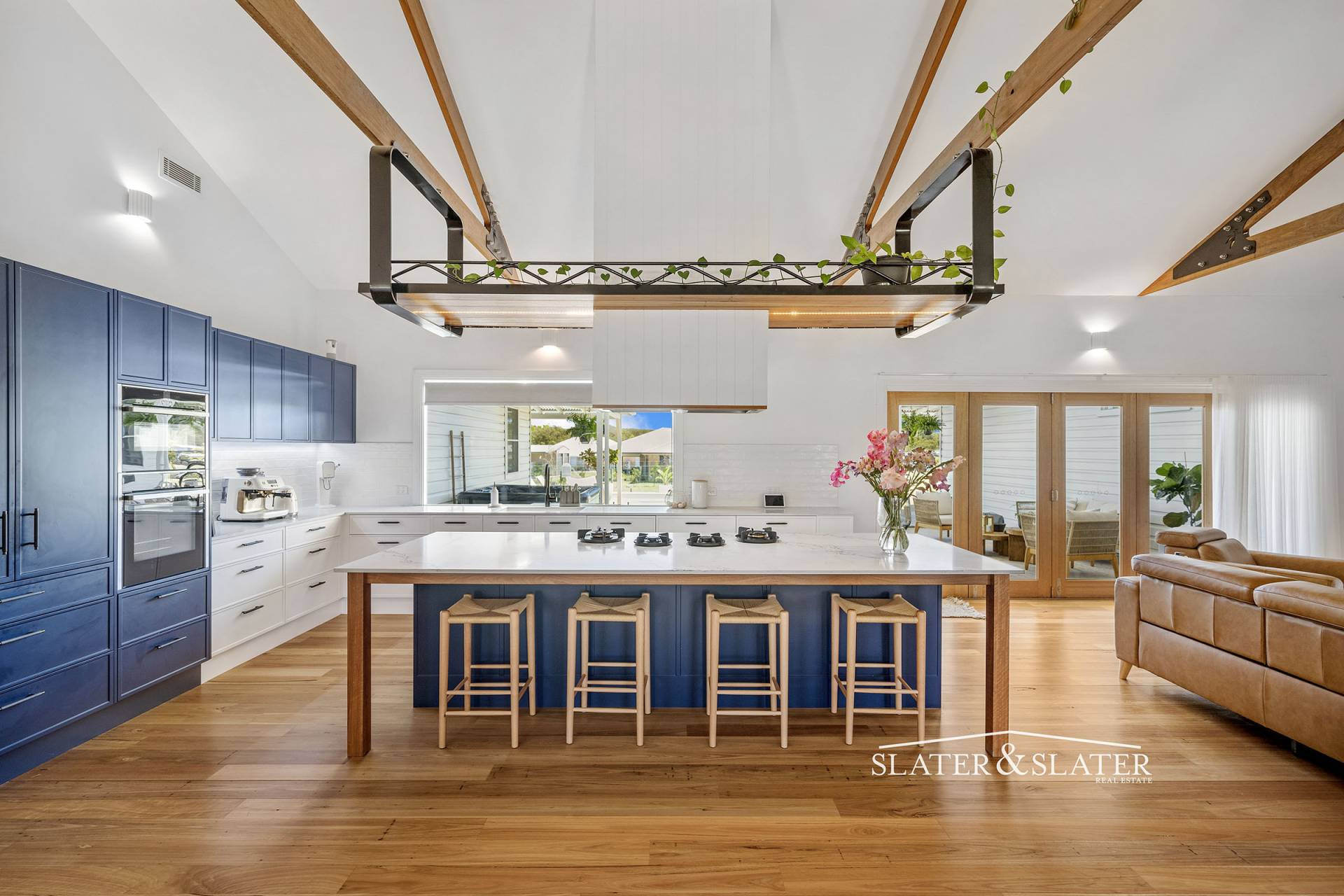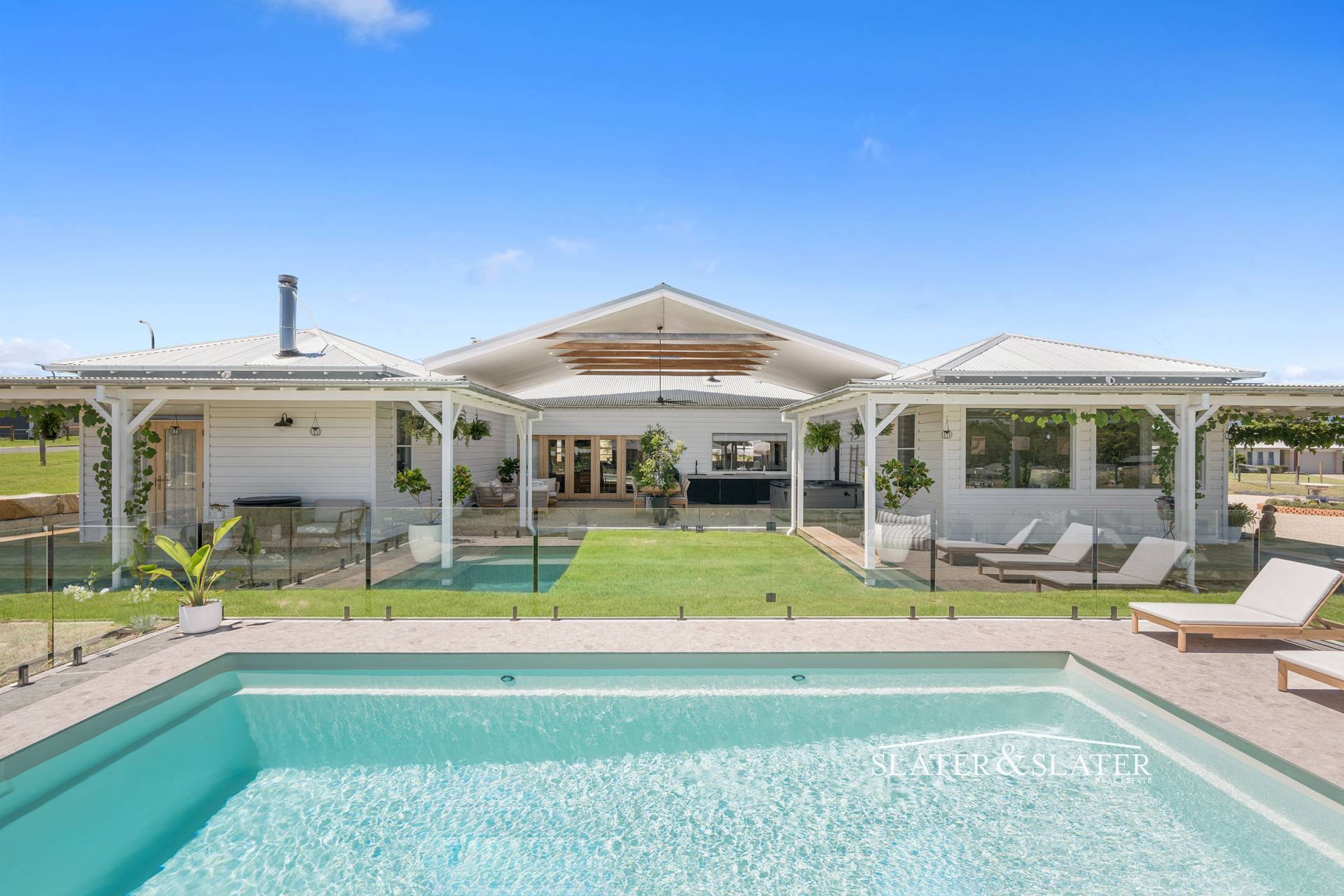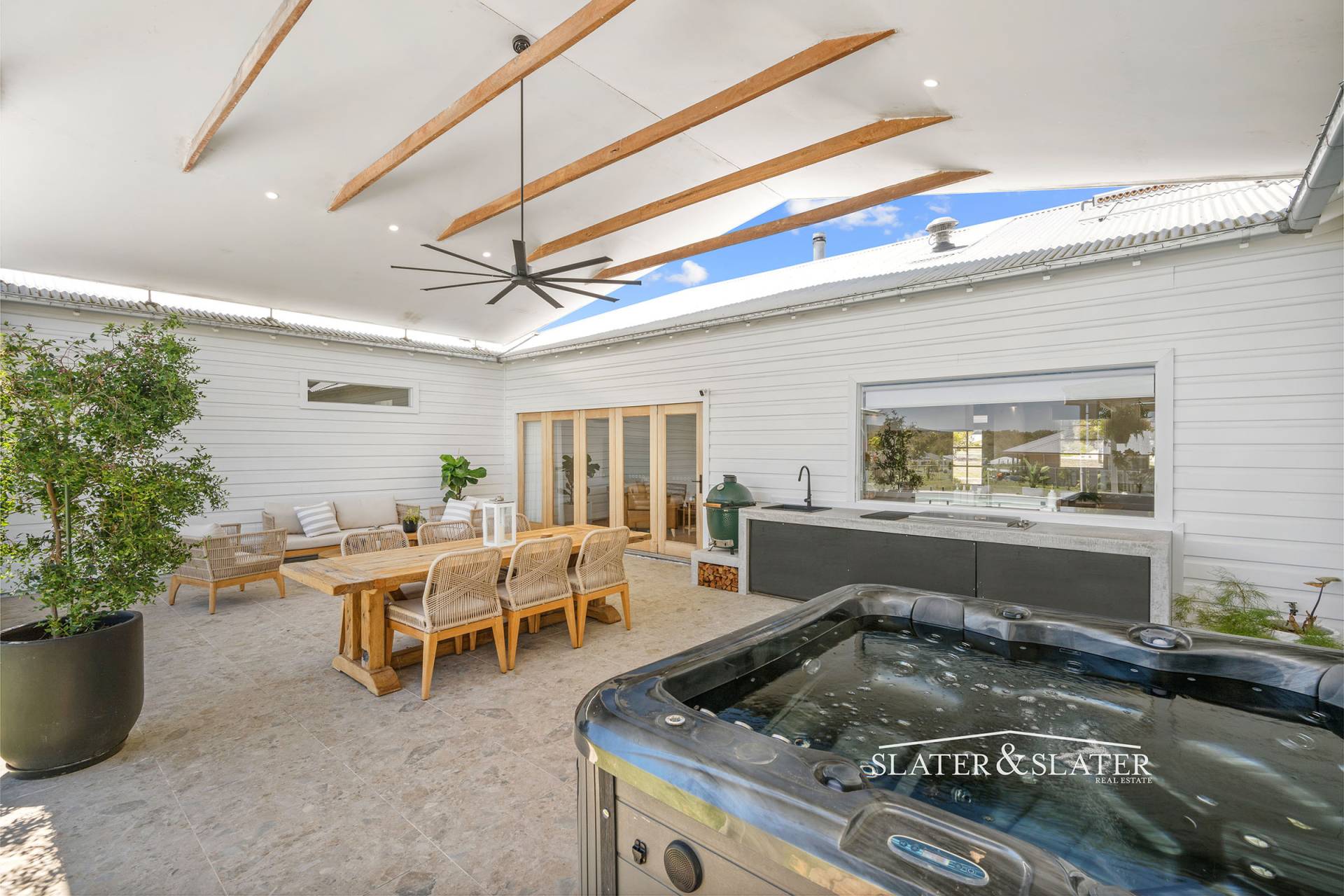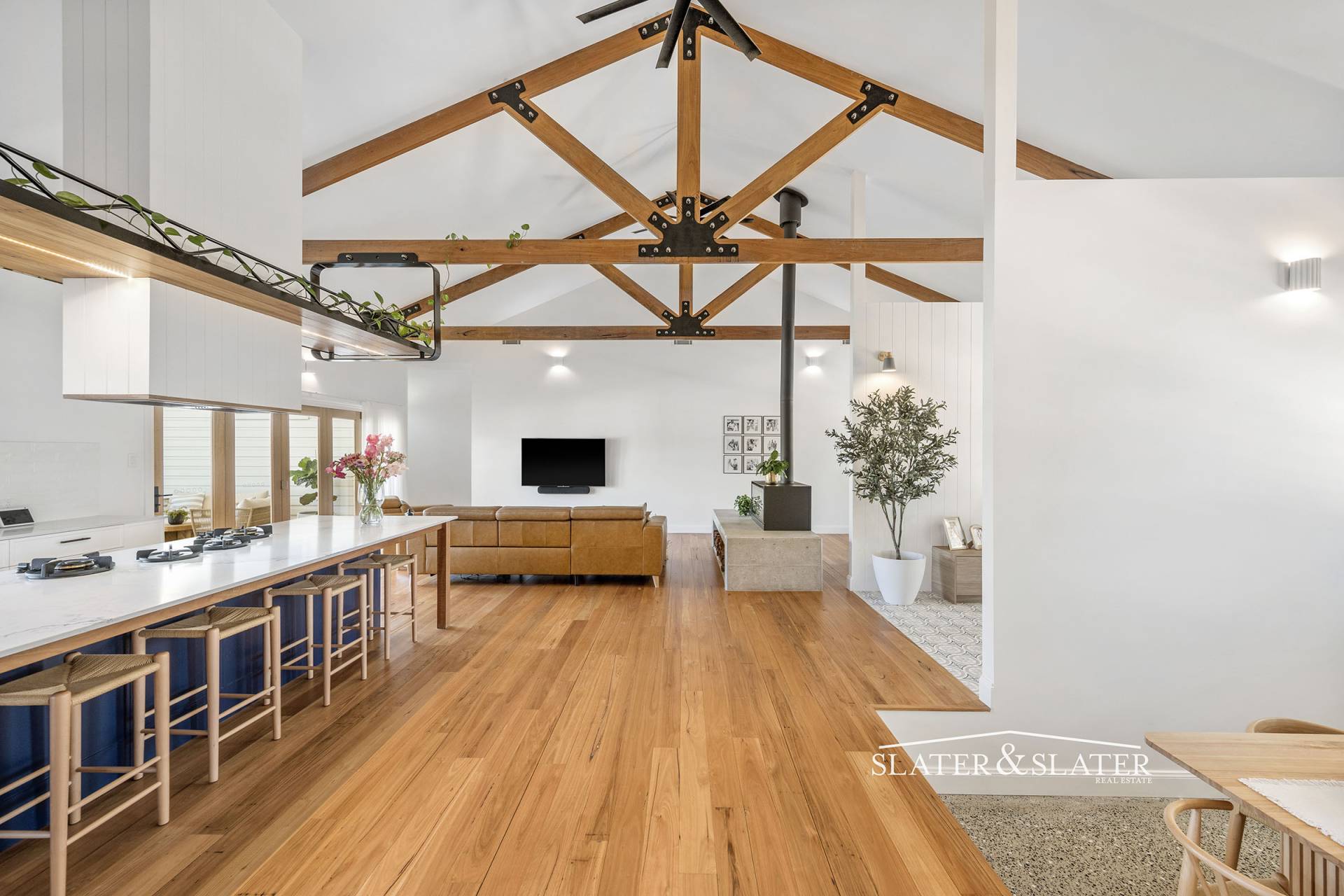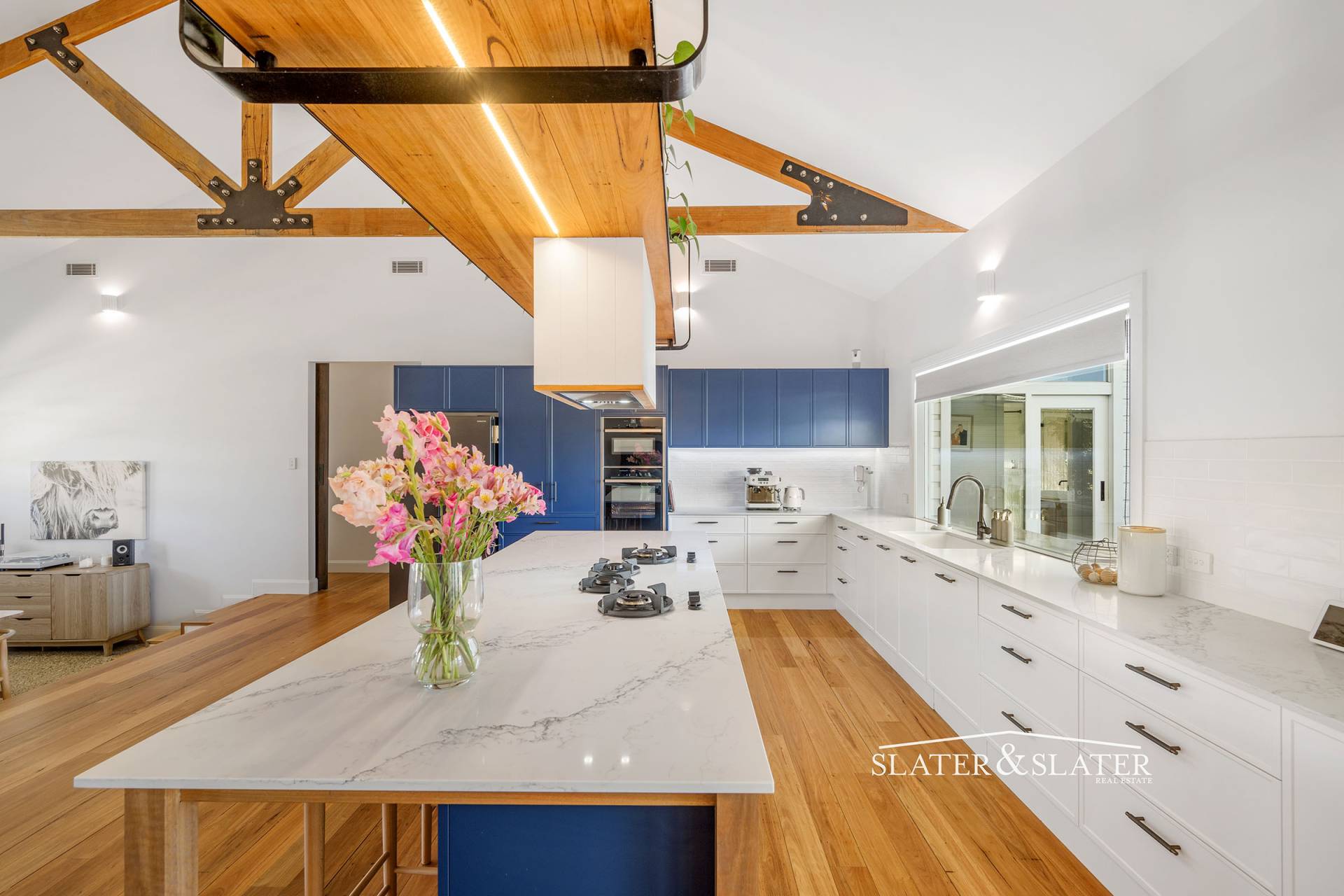 The expansive main homestead blends classic and modern with impeccable presentation showcasing the flowing floor-plan and generous dimensions. Soaring ceilings with exposed trusses feature in the main living, dining and kitchen zone. This impressive space offers indoor/outdoor living and entertaining as it flows out through bi-fold doors to the substantial al-fresco area with built in outdoor kitchen, spa and in-ground pool.