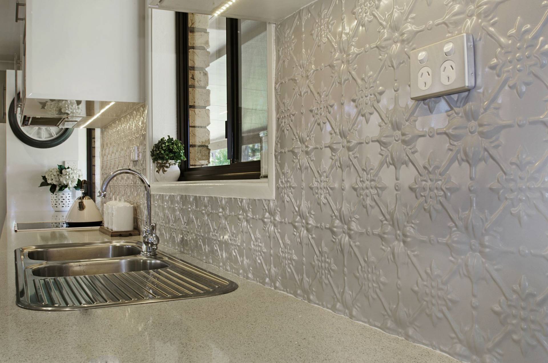 The spacious kitchen features 2-pac cabinetry, caesar stone bench tops, silver pressed metal detailing, large island bench/breakfast bar and new appliances.
